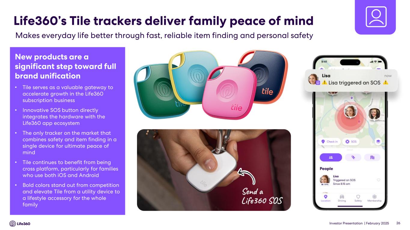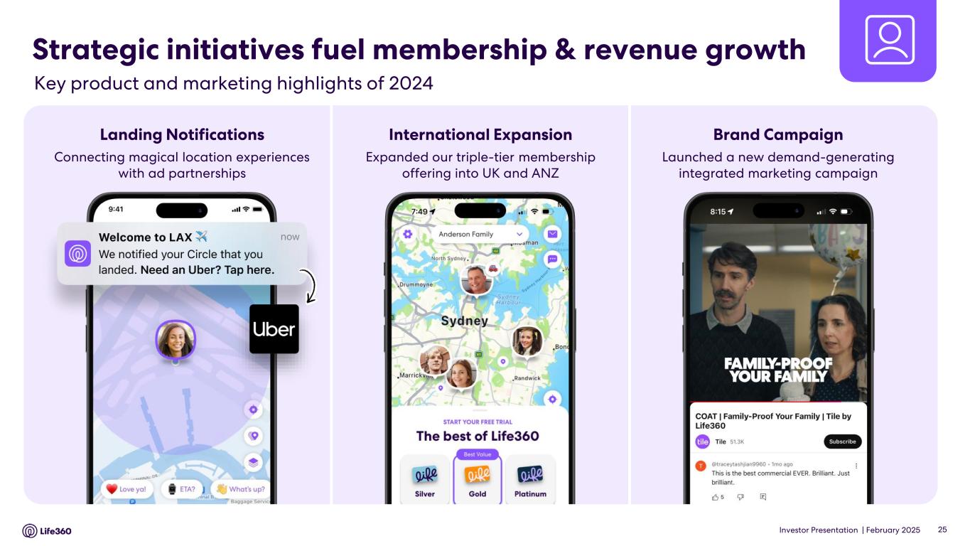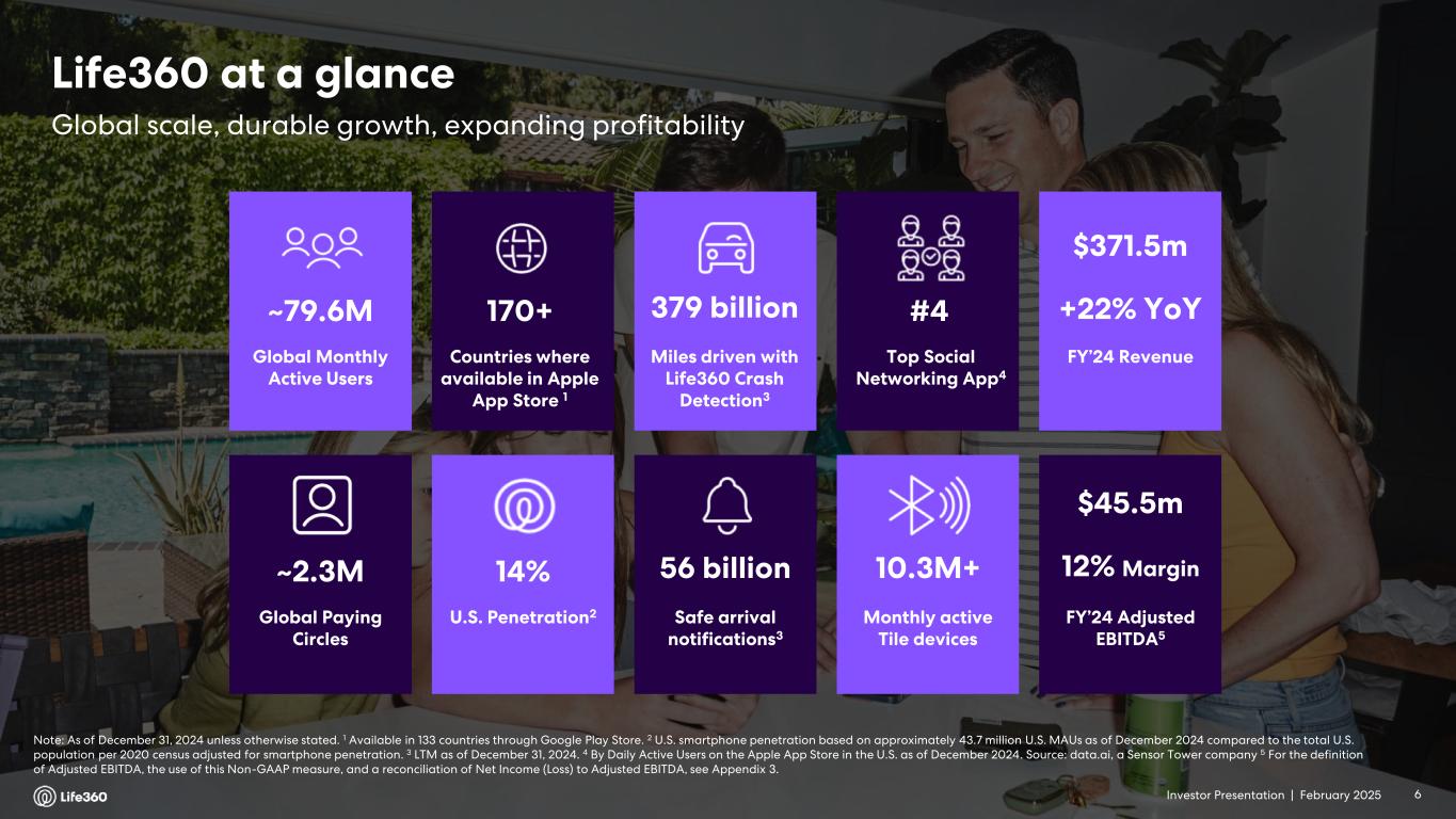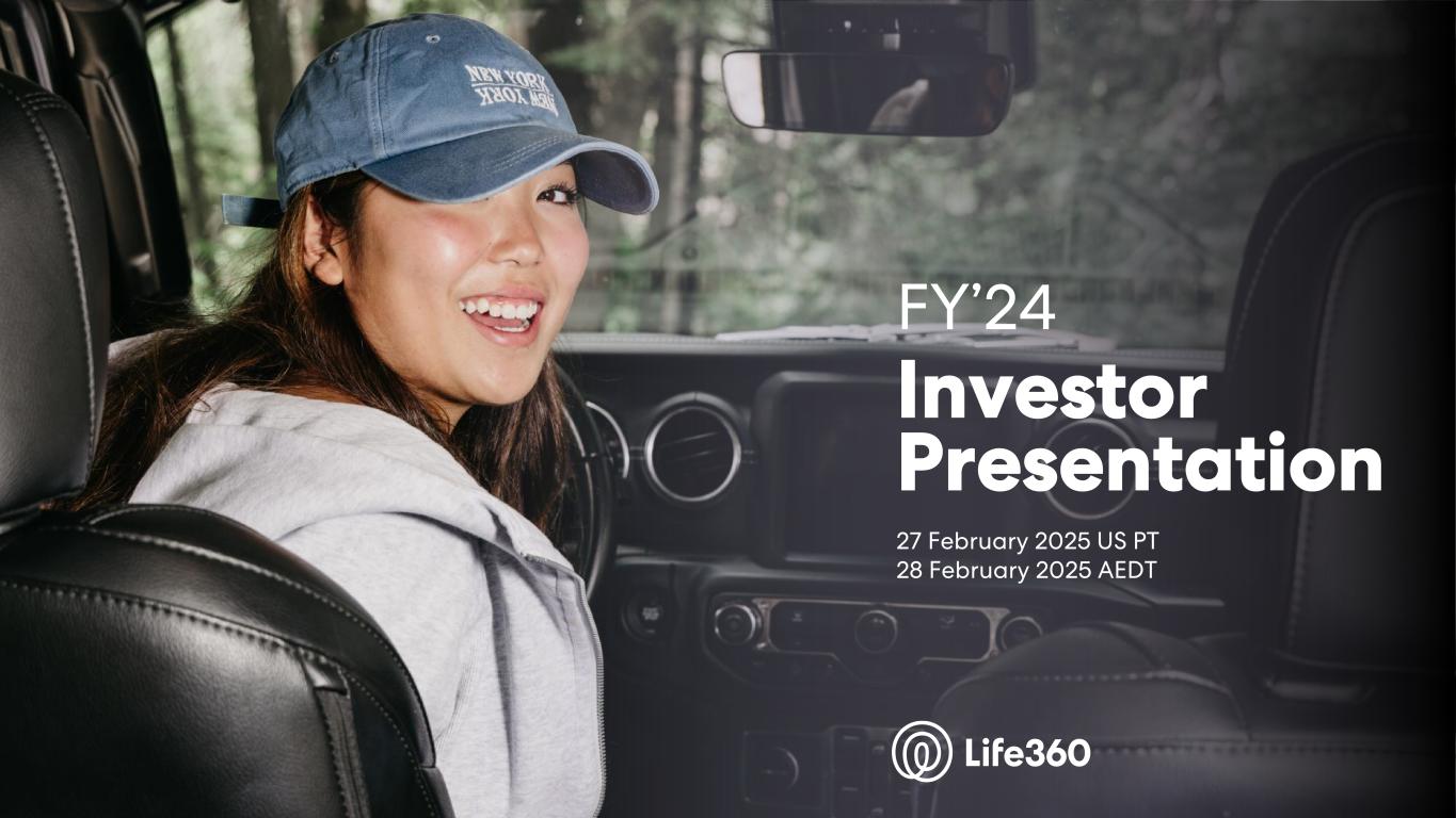 Investor Presentation | February 2025 DISCLAIMER These materials and the accompanying oral presentation have been prepared by Life360, Inc. (ARBN 629 412 942) (“Company”) on a confidential and non-reliance basis, and may not be reproduced in whole or in part, nor may any of its contents be disclosed, to any other person, without the prior written consent of the Company. These materials are for informational purposes only. This presentation contains summary information about the Company and its activities and is current as of the date of this presentation. This presentation does not purport to be all-inclusive or to contain all of the information you may desire. It should be read in conjunction with the Company’s periodic and continuous disclosure announcements filed with the Australian Securities Exchange and the U.S. Securities and Exchange Commission (“SEC”), available at www.asx.com.au and www.sec.gov, respectively. These materials do not constitute an offer, invitation, solicitation or recommendation with respect to the purchase or sale of any security in the Company or interest therein nor does it constitute financial product advice. These materials are not a prospectus, product disclosure statement or other offer document under Australian law or under any other law. These materials have not been filed, registered or approved by regulatory authorities in any jurisdiction. This communication is restricted by law; it is not intended for distribution to, or use by any person in, any jurisdiction where such distribution or use would be contrary to local law or regulation. The information contained in these materials is not intended to be relied upon as advice or a recommendation to investors and is not intended to form the basis of any investment decision in the Company’s securities. The information does not take into account the investment objectives, financial situation, taxation situation or needs of any particular investor. An investor must not act on the basis of any matter contained in these materials but must make its own assessment of the Company and conduct its own investigations and analysis. Investors should assess their own individual financial circumstances and consider talking to a financial adviser, professional adviser or consultant before making any investment decision. By reading these materials you agree to be bound by the limitations set out in these materials. No representation or warranty, express or implied, is made as to the accuracy, reliability, completeness or fairness of the information, opinions, forecasts, reports, estimates and conclusions contained in these materials. The Company does not undertake any obligation to provide any additional information nor update or revise the information in these materials nor correct any inaccuracies or omissions. To the maximum extent permitted by law, none of the Company and its related bodies corporate, or their respective directors, employees or agents, nor any other person accepts any responsibility nor any liability for loss arising from the use of or reliance on information contained in these materials or otherwise arising in connection with it, nor in relation to any other written or oral information or opinions provided now or in the future to the recipient or its advisers and representatives, including without limitation any liability from fault of negligence. Past performance is not indicative of future performance and no guarantee of future returns is implied or given. Nothing contained in these materials nor any information made available to you is, or shall be relied upon as, a promise, representation, warranty or guarantee as to the past, present or the future performance of the Company. Certain statements in these materials constitute forward-looking statements within the meaning of the Private Securities Litigation Reform Act of 1995 (“PLSRA”), Section 27A of the Securities Act of 1933, as amended, and Section 21E of the Securities Exchange Act of 1934, as amended (the “Exchange Act”). Statements that are not historical in nature, including the words “anticipate”, “expect”, “suggests”, “plan”, “believe”, “intend”, “estimates”, “targets”, “projects”, “should”, “could”, “would”, “may”, “will”, “forecast,” “opportunity,” “goal,” “vision,” “outlook” and other similar expressions are intended to identify forward-looking statements. These forward- looking statements include, but are not limited to, statements regarding: the Company’s growth strategy and business plan and the Company’s ability to effectively manage its growth and meet future capital requirements; the Company’s expectations regarding future financial performance, including its expectations regarding its revenue, revenue growth, adjusted EBITDA, and operating cash flow, and the Company’s ability to achieve or maintain future profitability; the Company’s ability to further penetrate its existing member base, maintain and expand its member base and increase monetization of its member base; the Company’s ability to expand internationally and the significance of its global opportunity; the Company’s ability to anticipate market needs or develop new products and services or enhance existing products and services to meet those needs; and the Company’s ability to increase sales of its products and services. Such forward-looking statements are prediction, projections and other statements about future events that are based on current expectations and assumptions and, as a result, involve known and unknown risks, uncertainties, assumptions and other important factors, many of which are beyond the control of the Company and which may cause actual results, performance or achievements to differ materially from those expressed or implied by such statements. Forward-looking statements are provided as a general guide only, and should not be relied on as