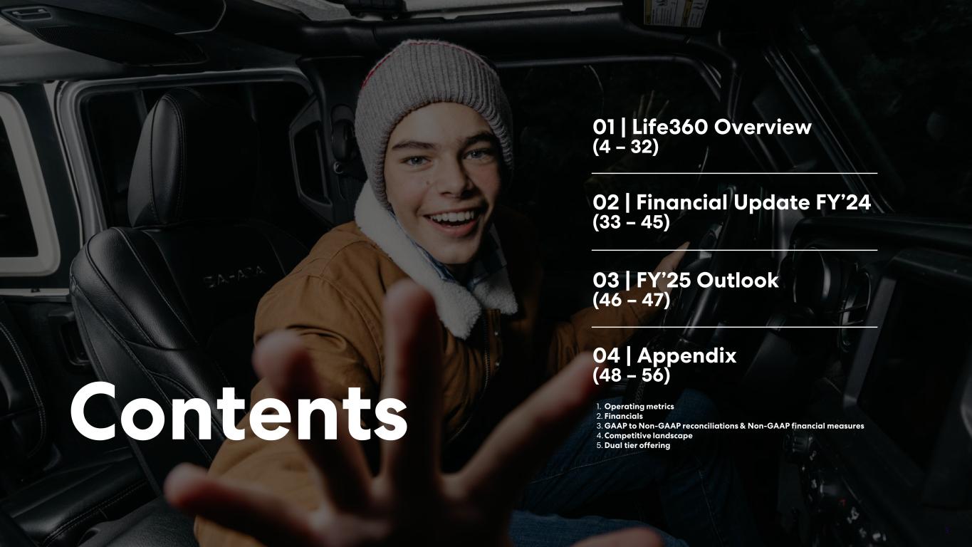Investor Presentation | February 2025 01 | Life360 Overview (4 – 32) 02 | Financial Update FY’24 (33 – 45) Contents 03 | FY’25 Outlook (46 – 47) 1. 2. 3. 4. 5. 04 | Appendix (48 – 56) Operating metrics Financials GAAP to Non-GAAP reconciliations & Non-GAAP financial measures Competitive landscape Dual tier offering 3