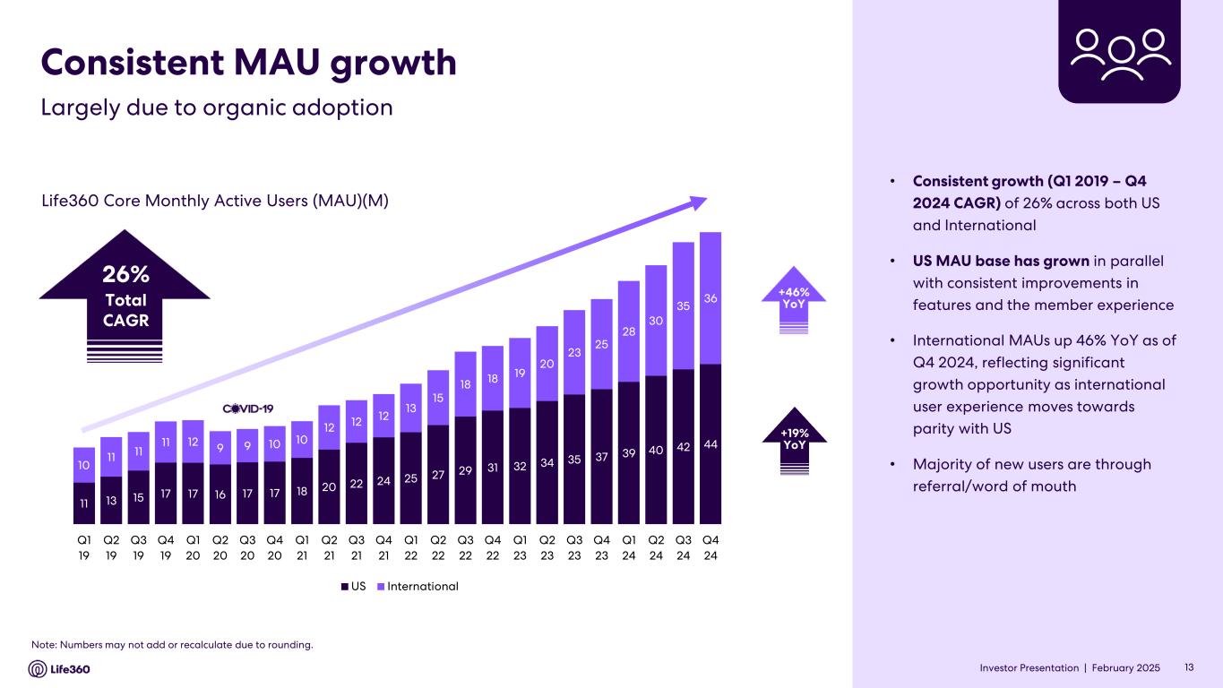 Investor Presentation | February 2025 Grow our audience By building a leading position as a global family brand Scale paid offerings By driving higher retention and conversion through increased value for members Create new revenue streams By meeting family needs at every life stage and strengthening relationships with members Expand profitability By leveraging the expense base, and balancing growth investment with financial discipline Powerful network effects driving significant long-term growth opportunity Life360 strategy 12Investor Presentation |