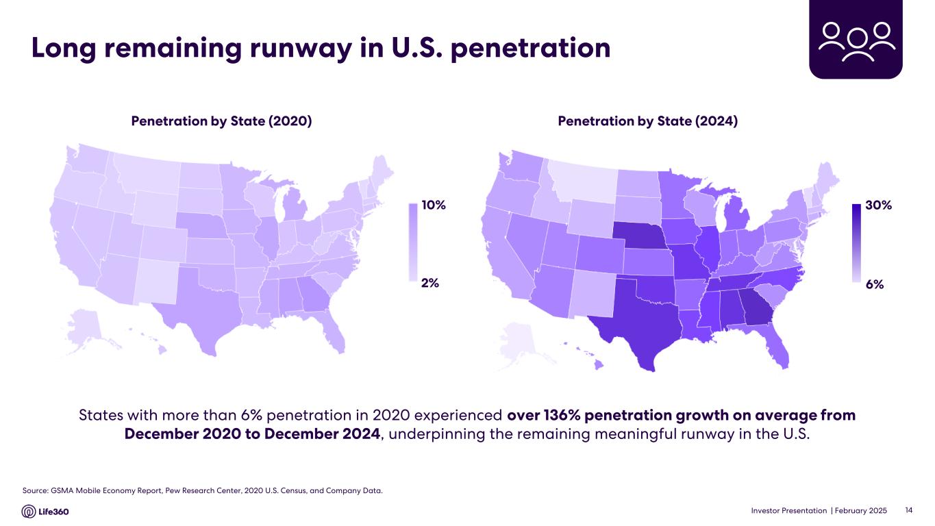 Investor Presentation | February 2025 Consistent MAU growth • Consistent growth (Q1 2019 – Q4 2024 CAGR) of 26% across both US and International • US MAU base has grown in parallel with consistent improvements in features and the member experience • International MAUs up 46% YoY as of Q4 2024, reflecting significant growth opportunity as international user experience moves towards parity with US • Majority of new users are through referral/word of mouth Life360 Core Monthly Active Users (MAU)(M) Note: Numbers may not add or recalculate due to rounding. 13 Largely due to organic adoption 26% Total CAGR +46% YoY +19% YoY Investor Presentation | 11 13 15 17 17 16 17 17 18 20 22 24 25 27 29 31 32 34 35 37 39 40 42 44 10 11 11 11 12 9 9 10 10 12 12 12 13 15 18 18 19 20 23 25 28 30 35 36 Q1 19 Q2 19 Q3 19 Q4 19 Q1 20 Q2 20 Q3 20 Q4 20 Q1 21 Q2 21 Q3 21 Q4 21 Q1 22 Q2 22 Q3 22 Q4 22 Q1 23 Q2 23 Q3 23 Q4 23 Q1 24 Q2 24 Q3 24 Q4 24 US International