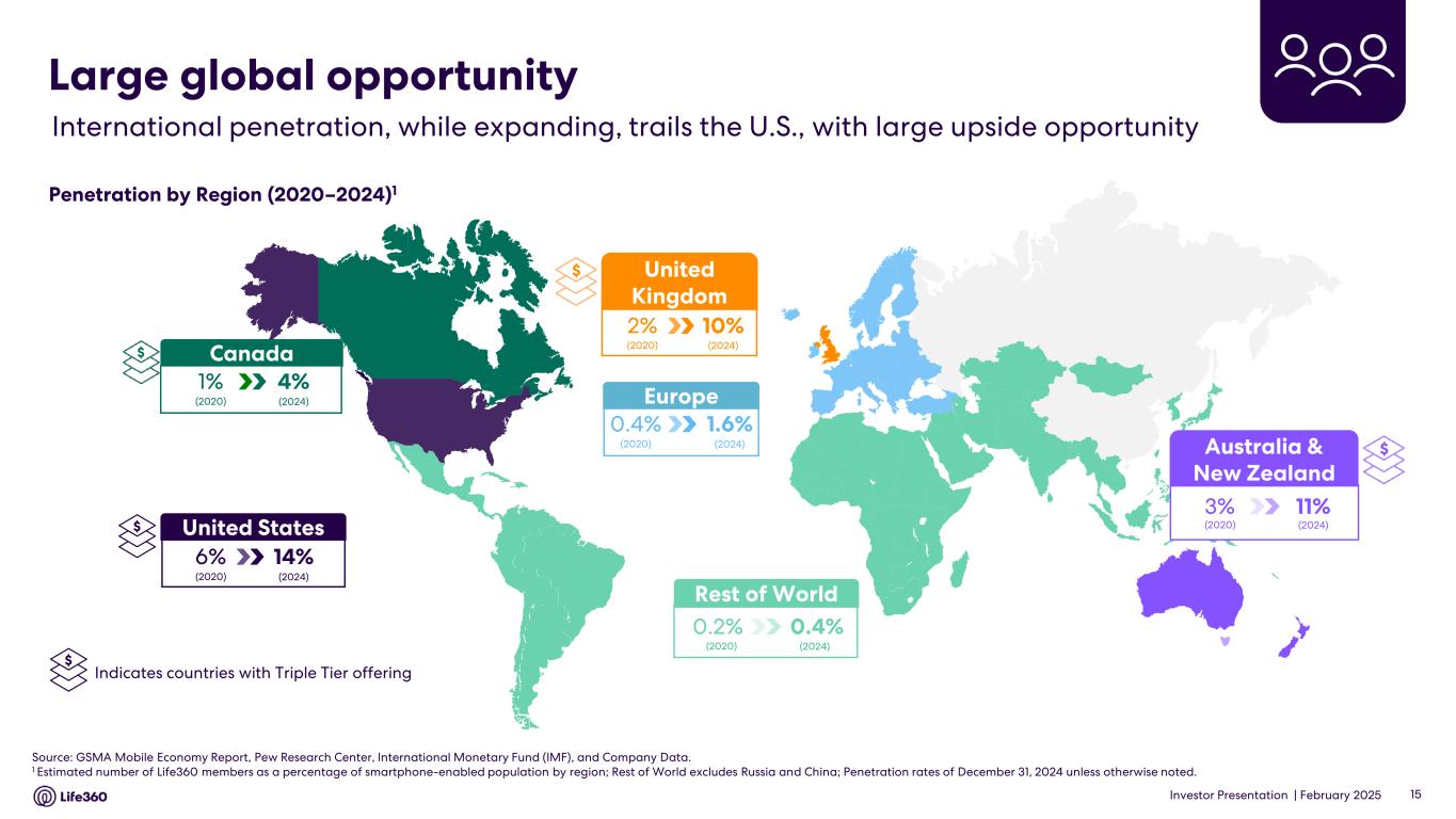 Investor Presentation | February 2025 Long remaining runway in U.S. penetration Penetration by State (2024)Penetration by State (2020) States with more than 6% penetration in 2020 experienced over 136% penetration growth on average from December 2020 to December 2024, underpinning the remaining meaningful runway in the U.S. 10% 2% 30% 6% Source: GSMA Mobile Economy Report, Pew Research Center, 2020 U.S. Census, and Company Data. 14