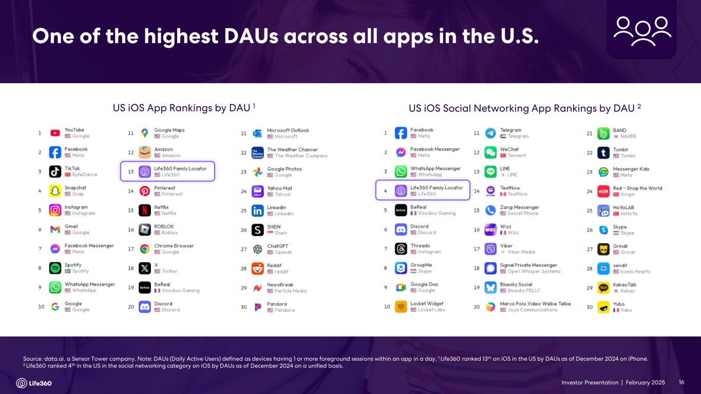 Investor Presentation | February 2025 Source: GSMA Mobile Economy Report, Pew Research Center, International Monetary Fund (IMF), and Company Data. 1 Estimated number of Life360 members as a percentage of smartphone-enabled population by region; Rest of World excludes Russia and China; Penetration rates of December 31, 2024 unless otherwise noted. Rest of World 0.4%0.2% (2020) (2024) Europe 1.6%0.4% (2020) (2024) International penetration, while expanding, trails the U.S., with large upside opportunity Large global opportunity Penetration by Region (2020–2024)1 15 $Australia & New Zealand 11%3% (2020) (2024)United States 14%6% (2020) (2024) Canada 4%1% (2020) (2024) $ United Kingdom 10%2% (2020) (2024) $ Indicates countries with Triple Tier offering $ $