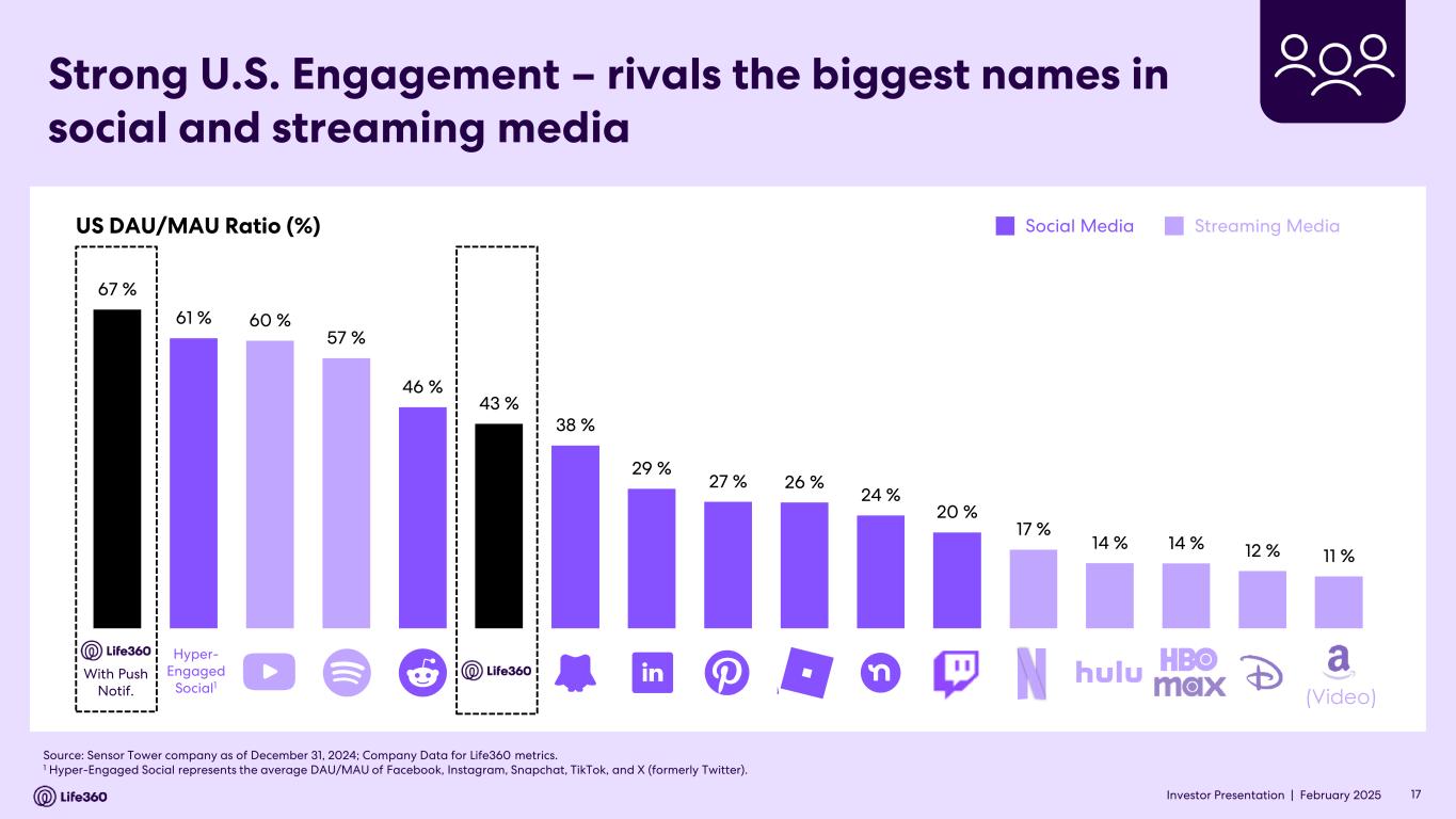 Investor Presentation | February 2025 US iOS App Rankings by DAU 1 US iOS Social Networking App Rankings by DAU 2 Source: data.ai, a Sensor Tower company. Note: DAUs (Daily Active Users) defined as devices having 1 or more foreground sessions within an app in a day. 1 Life360 ranked 13th on iOS in the US by DAUs as of December 2024 on iPhone. 2 Life360 ranked 4th in the US in the social networking category on iOS by DAUs as of December 2024 on a unified basis. 16 One of the highest DAUs across all apps in the U.S. Investor Presentation |