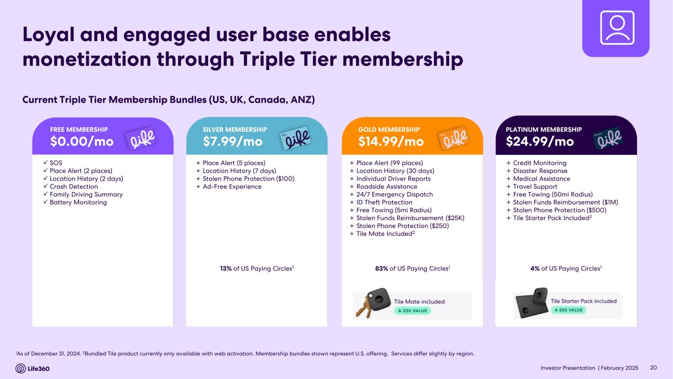 Investor Presentation | February 2025 New Member Onboarding Frictionless download & registration Free Member Experience features Paid Subscriber Upsell to Paid Subscriber Paid Subscriber Upsell to higher tier + Other products Life360’s digital based freemium business Monetization: Advertising + Data + Lead Gen Premium Subscription Referral Fees Other Sales1 Cost to provide: Hosting & other technology costs Membership benefit costs + app store commissions Referral costs1 Marketing Efforts Conversion / Retention initiatives Member Experience & Product Efforts 1 Represents potential revenue and costs associated with future opportunities. This statement is forward-looking, subject to significant business, economic, regulatory and competitive uncertainties and contingencies, many of which are beyond the control of the Company and its management, and are based upon assumptions with respect to future decisions, which are subject to change. Actual results will vary and those variations may be material. For discussion of some of the important factors that could cause these variations, please consult the "Risk Factors" section in our most recent Annual Report on Form 10-K, as well as any amendments thereto reflected in subsequent Quarterly Reports on Form 10-Q and other filings with the SEC. 19 Freemium model becomes powerful at scale • Strong word of mouth drives organic growth, supporting efficient customer acquisition spend • Digital economics enables efficient scaling of user base, with low cost/high margin subscription services • Growing free member base: - creates a competitive moat - increases premium member acquisition pool and - provides indirect monetization opportunities, including advertising Investor Presentation |