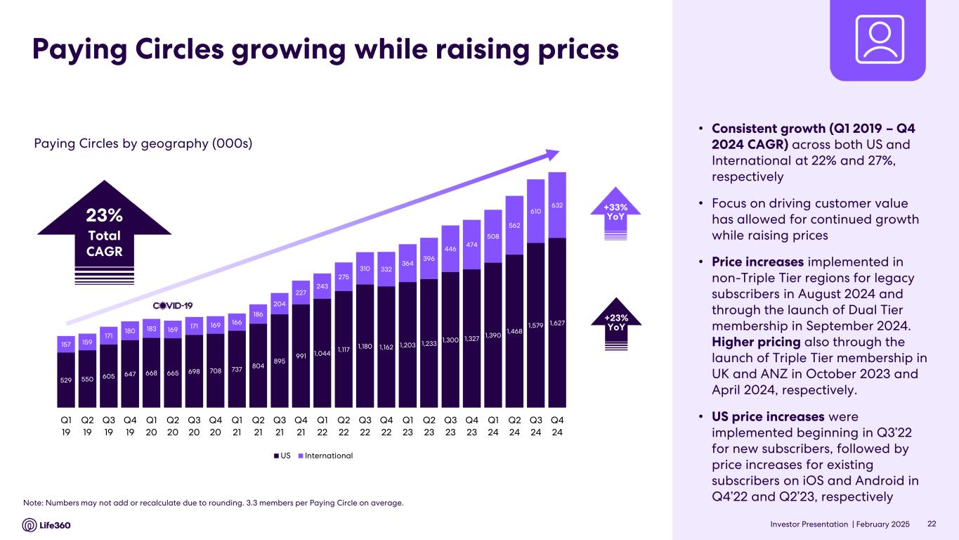 Investor Presentation | February 2025 Paying Circles growing while raising prices Paying Circles by geography (000s) • Consistent growth (Q1 2019 – Q4 2024 CAGR) across both US and International at 22% and 27%, respectively • Focus on driving customer value has allowed for continued growth while raising prices • Price increases implemented in non-Triple Tier regions for legacy subscribers in August 2024 and through the launch of Dual Tier membership in September 2024. Higher pricing also through the launch of Triple Tier membership in UK and ANZ in October 2023 and April 2024, respectively. • US price increases were implemented beginning in Q3’22 for new subscribers, followed by price increases for existing subscribers on iOS and Android in Q4’22 and Q2’23, respectively Note: Numbers may not add or recalculate due to rounding. 3.3 members per Paying Circle on average. 22 +33% YoY +23% YoY 23% Total CAGR 529 550 605 647 668 665 698 708 737 804 895 991 1,044 1,117 1,180 1,162 1,203 1,233 1,300 1,327 1,390 1,468 1,579 1,627 157 159 171 180 183 169 171 169 166 186 204 227 243 275 310 332 364 396 446 474 508 562 610 632 Q1 19 Q2 19 Q3 19 Q4 19 Q1 20 Q2 20 Q3 20 Q4 20 Q1 21 Q2 21 Q3 21 Q4 21 Q1 22 Q2 22 Q3 22 Q4 22 Q1 23 Q2 23 Q3 23 Q4 23 Q1 24 Q2 24 Q3 24 Q4 24 US International