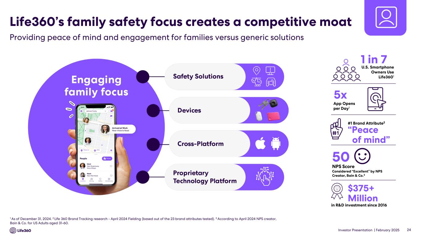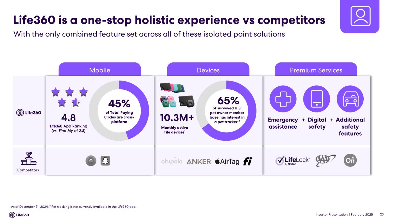 Investor Presentation | February 2025 Premium ServicesDevicesMobile Life360 is a one-stop holistic experience vs competitors With the only combined feature set across all of these isolated point solutions 1 As of December 31, 2024. 2 Pet tracking is not currently available in the Life360 app. 10.3M+ 65% of surveyed U.S. pet owner member base has interest in a pet tracker 2 Monthly active Tile devices1 Emergency assistance Digital safety Additional safety features + +4.8 Life360 App Ranking (vs. Find My at 2.8) Competitors 23 45% of Total Paying Circles are cross- platform