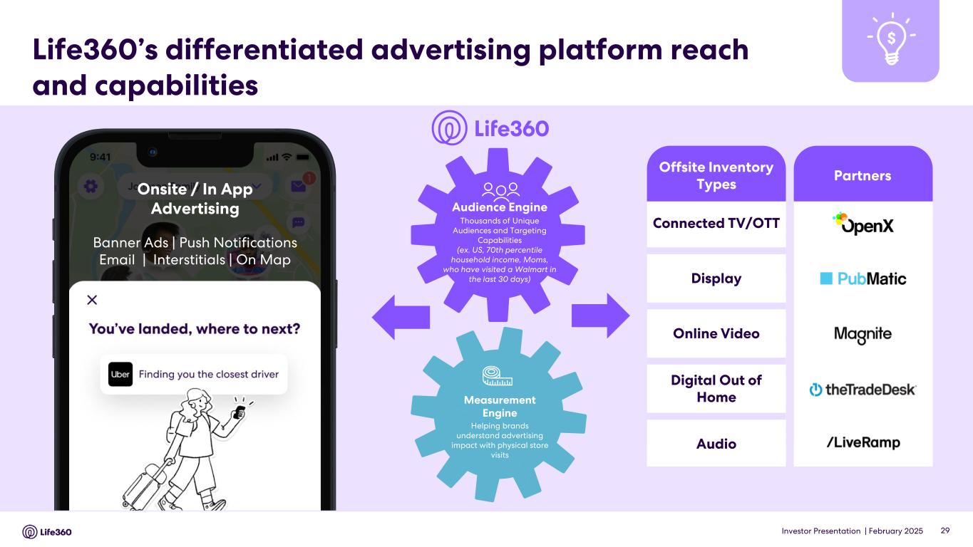 Investor Presentation | February 2025 High value offsite and direct sales advertising are differentiators for Life360’s advertising model 28 The Future New & Expanded Sales Channels + Improved Ad Relevance, Data and Delivery + Expanded Ad Formats / Surfaces = Long-term Revenue and Value Driving Higher Average Revenue Per User Over Time Third party sales teams, Programmatic relationships Ad Testing & Infrastructure Development Paid Partnerships Pursue paid partnerships in parallel to programmatic ads Direct Sales Expand direct sales efforts while continuing to leverage programmatic ads Offsite Explore offsite (retargeting) opportunities to help brands connect with our members A v e ra g e R e v e n u e P e r U se r