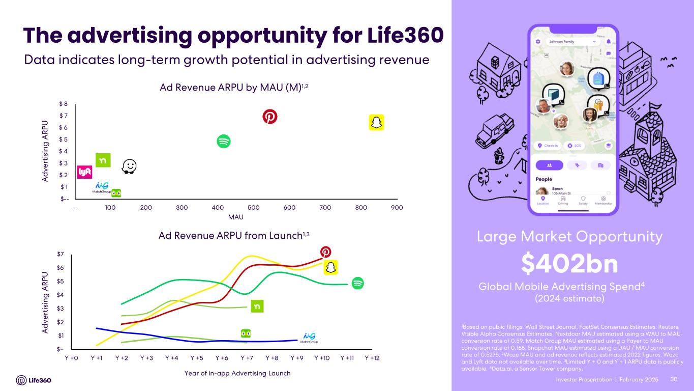 Investor Presentation | February 2025 Partners Life360’s differentiated advertising platform reach and capabilities 29 Audience Engine Thousands of Unique Audiences and Targeting Capabilities (ex. US, 70th percentile household income, Moms, who have visited a Walmart in the last 30 days) Measurement Engine Helping brands understand advertising impact with physical store visits Connected TV/OTT Display Online Video Digital Out of Home Audio Offsite Inventory TypesOnsite / In App Advertising Banner Ads | Push Notifications Email | Interstitials | On Map
