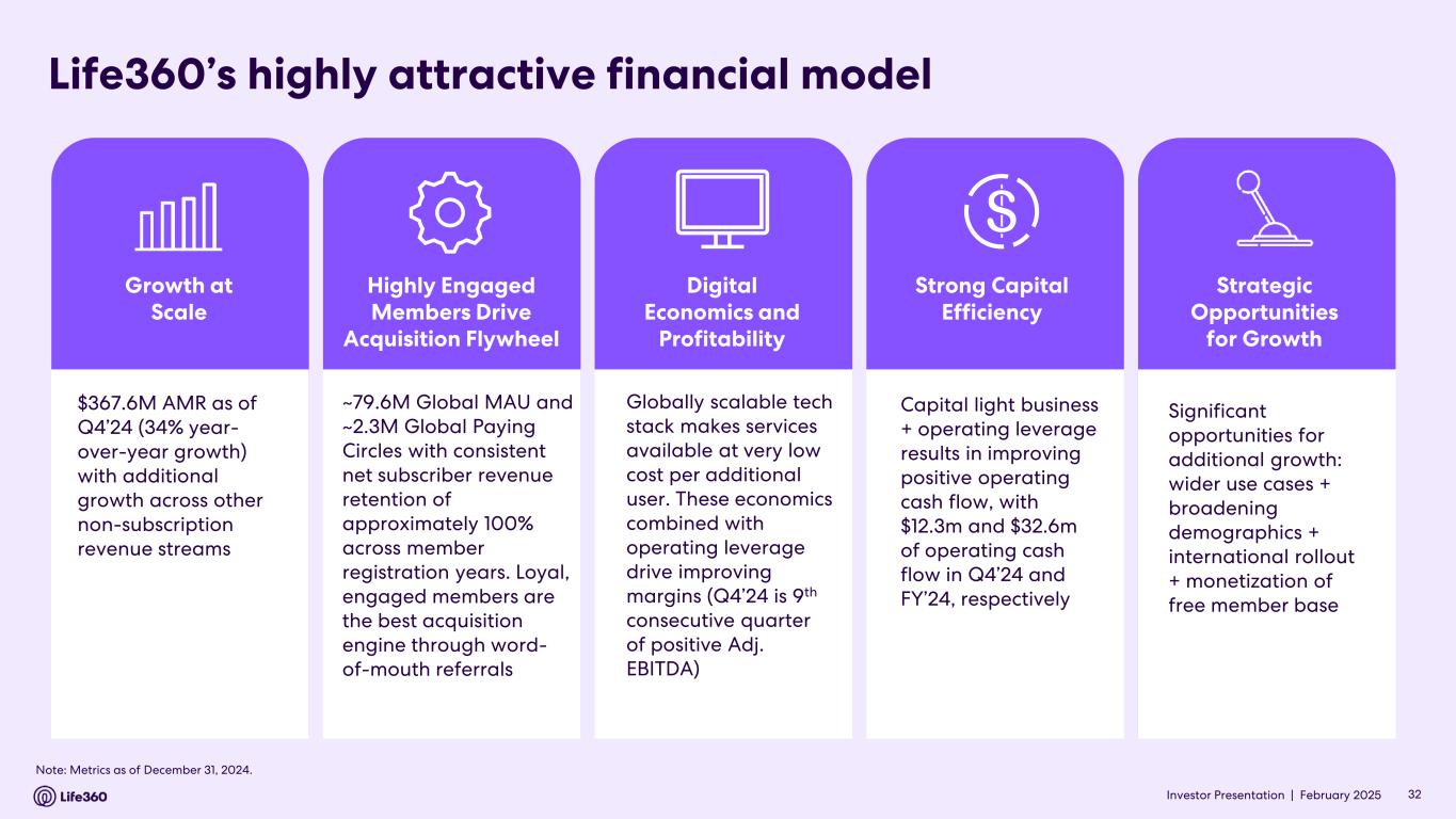 Investor Presentation | February 2025 Recognized leader in family safety and security Fully integrated cross- platform offering through leading mobile app & supporting devices Loyal and engaged user base with multiple monetization vectors including advertising Global opportunity with tailwinds from demographics and accelerating adoption of location sharing Scalable business model driven by recurring revenue with opportunity to expand profitability Strong brand awareness and freemium model driving powerful network effects What sets Life360 apart 31