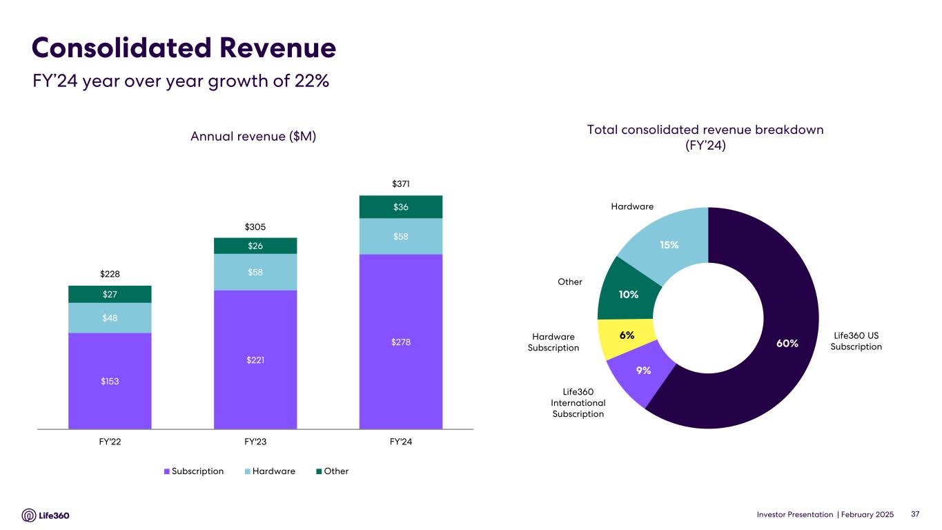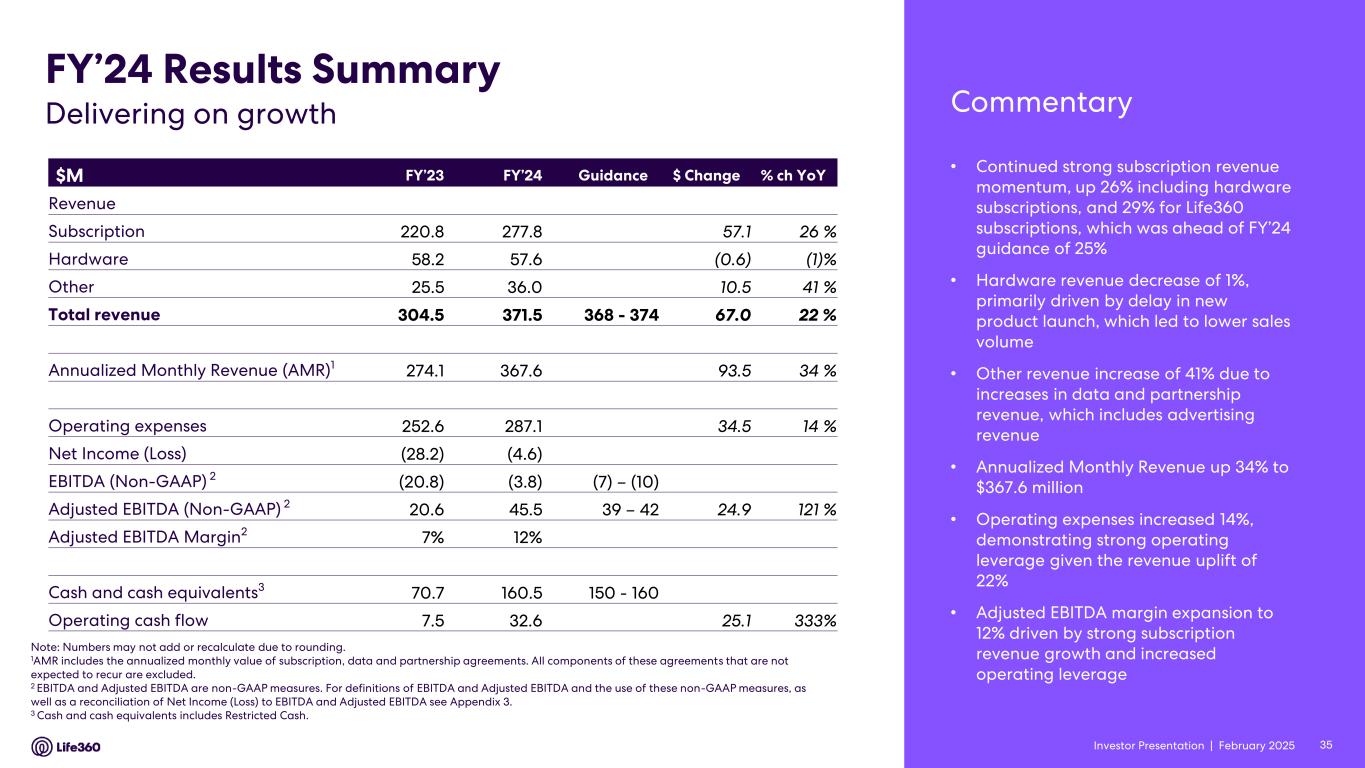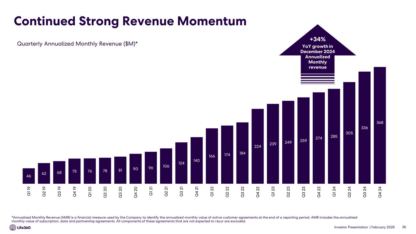 Investor Presentation | February 2025 • Continued strong subscription revenue momentum, up 26% including hardware subscriptions, and 29% for Life360 subscriptions, which was ahead of FY’24 guidance of 25% • Hardware revenue decrease of 1%, primarily driven by delay in new product launch, which led to lower sales volume • Other revenue increase of 41% due to increases in data and partnership revenue, which includes advertising revenue • Annualized Monthly Revenue up 34% to $367.6 million • Operating expenses increased 14%, demonstrating strong operating leverage given the revenue uplift of 22% • Adjusted EBITDA margin expansion to 12% driven by strong subscription revenue growth and increased operating leverage $M FY’23 FY’24 Guidance $ Change % ch YoY Revenue Subscription 220.8 277.8 57.1 26 % Hardware 58.2 57.6 (0.6) (1)% Other 25.5 36.0 10.5 41 % Total revenue 304.5 371.5 368 - 374 67.0 22 % Annualized Monthly Revenue (AMR)1 274.1 367.6 93.5 34 % Operating expenses 252.6 287.1 34.5 14 % Net Income (Loss) (28.2) (4.6) EBITDA (Non-GAAP) 2 (20.8) (3.8) (7) – (10) Adjusted EBITDA (Non-GAAP) 2 20.6 45.5 39 – 42 24.9 121 % Adjusted EBITDA Margin2 7% 12% Cash and cash equivalents3 70.7 160.5 150 - 160 Operating cash flow 7.5 32.6 25.1 333% Note: Numbers may not add or recalculate due to rounding. 1AMR includes the annualized monthly value of subscription, data and partnership agreements. All components of these agreements that are not expected to recur are excluded. 2 EBITDA and Adjusted EBITDA are non-GAAP measures. For definitions of EBITDA and Adjusted EBITDA and the use of these non-GAAP measures, as well as a reconciliation of Net Income (Loss) to EBITDA and Adjusted EBITDA see Appendix 3. 3 Cash and cash equivalents includes Restricted Cash. FY’24 Results Summary CommentaryDelivering on growth 35Investor Presentation |