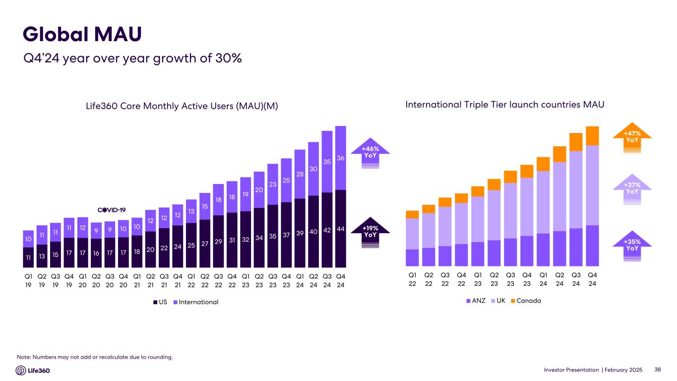 Investor Presentation | February 2025 Life360 Core Monthly Active Users (MAU)(M) Note: Numbers may not add or recalculate due to rounding. Global MAU Q4’24 year over year growth of 30% International Triple Tier launch countries MAU +37% YoY +47% YoY +35% YoY +46% YoY +19% YoY 38 Q1 22 Q2 22 Q3 22 Q4 22 Q1 23 Q2 23 Q3 23 Q4 23 Q1 24 Q2 24 Q3 24 Q4 24 ANZ UK Canada 11 13 15 17 17 16 17 17 18 20 22 24 25 27 29 31 32 34 35 37 39 40 42 44 10 11 11 11 12 9 9 10 10 12 12 12 13 15 18 18 19 20 23 25 28 30 35 36 Q1 19 Q2 19 Q3 19 Q4 19 Q1 20 Q2 20 Q3 20 Q4 20 Q1 21 Q2 21 Q3 21 Q4 21 Q1 22 Q2 22 Q3 22 Q4 22 Q1 23 Q2 23 Q3 23 Q4 23 Q1 24 Q2 24 Q3 24 Q4 24 US International