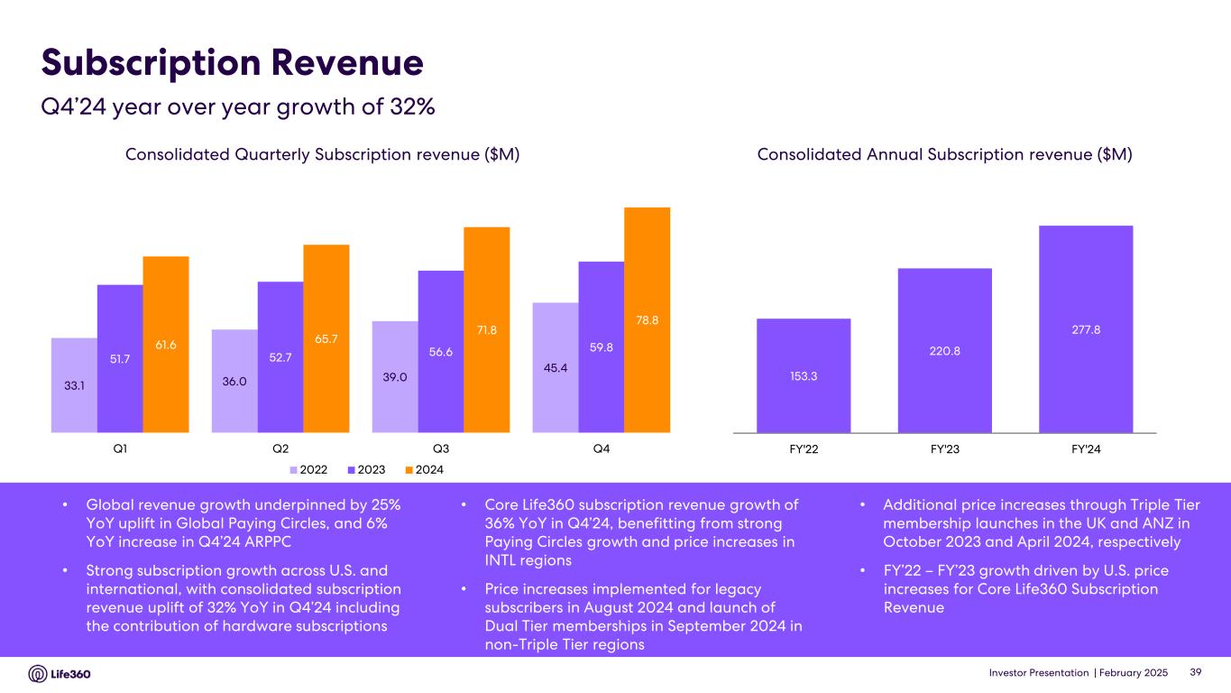 Investor Presentation | February 2025 Subscription Revenue Consolidated Quarterly Subscription revenue ($M) Consolidated Annual Subscription revenue ($M) • Global revenue growth underpinned by 25% YoY uplift in Global Paying Circles, and 6% YoY increase in Q4’24 ARPPC • Strong subscription growth across U.S. and international, with consolidated subscription revenue uplift of 32% YoY in Q4’24 including the contribution of hardware subscriptions • Core Life360 subscription revenue growth of 36% YoY in Q4’24, benefitting from strong Paying Circles growth and price increases in INTL regions • Price increases implemented for legacy subscribers in August 2024 and launch of Dual Tier memberships in September 2024 in non-Triple Tier regions • Additional price increases through Triple Tier membership launches in the UK and ANZ in October 2023 and April 2024, respectively • FY’22 – FY’23 growth driven by U.S. price increases for Core Life360 Subscription Revenue Q4’24 year over year growth of 32% 39 33.1 36.0 39.0 45.4 51.7 52.7 56.6 59.861.6 65.7 71.8 78.8 Q1 Q2 Q3 Q4 2022 2023 2024 153.3 220.8 277.8 FY'22 FY'23 FY'24