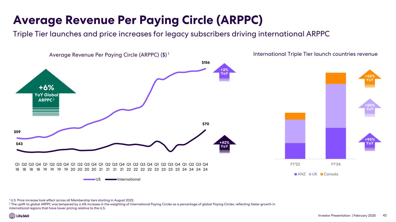 Investor Presentation | February 2025 Paying Circles by geography (000s) Paying Circles $140 $1398 +42% YoY$38 +42% YoYInternational Triple Tier launch countries Paying Circles +10% YoY +58% YoY +26% YoY +33% YoY +23% YoY 40 Note: Numbers may not add or recalculate due to rounding. Q1 22 Q2 22 Q3 22 Q4 22 Q1 23 Q2 23 Q3 23 Q4 23 Q1 24 Q2 24 Q3 24 Q4 24 ANZ UK Canada 529 550 605 647 668 665 698 708 737 804 895 991 1,044 1,117 1,180 1,162 1,203 1,233 1,300 1,327 1,390 1,468 1,579 1,627 157 159 171 180 183 169 171 169 166 186 204 227 243 275 310 332 364 396 446 474 508 562 610 632 Q1 19 Q2 19 Q3 19 Q4 19 Q1 20 Q2 20 Q3 20 Q4 20 Q1 21 Q2 21 Q3 21 Q4 21 Q1 22 Q2 22 Q3 22 Q4 22 Q1 23 Q2 23 Q3 23 Q4 23 Q1 24 Q2 24 Q3 24 Q4 24 US International Q4’24 year over year growth of 25% UK & ANZ Legacy price increases