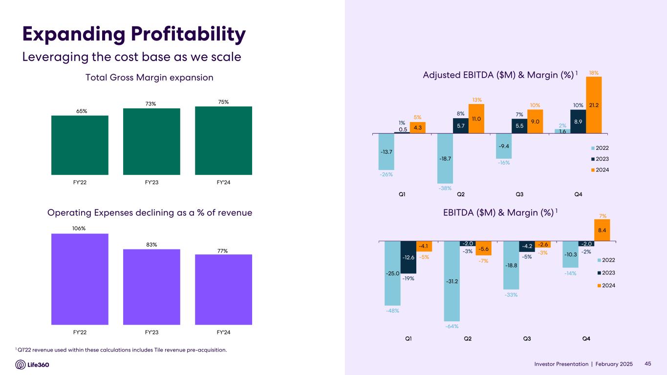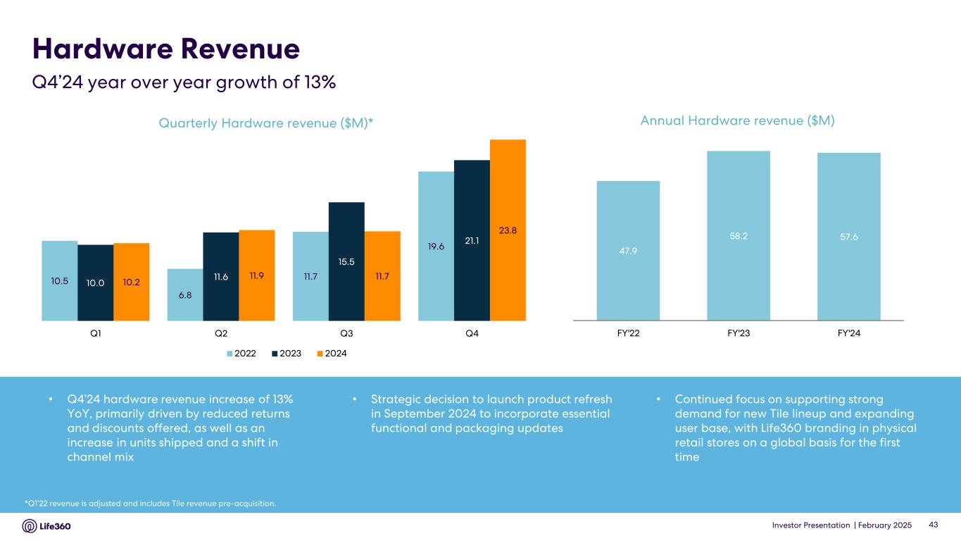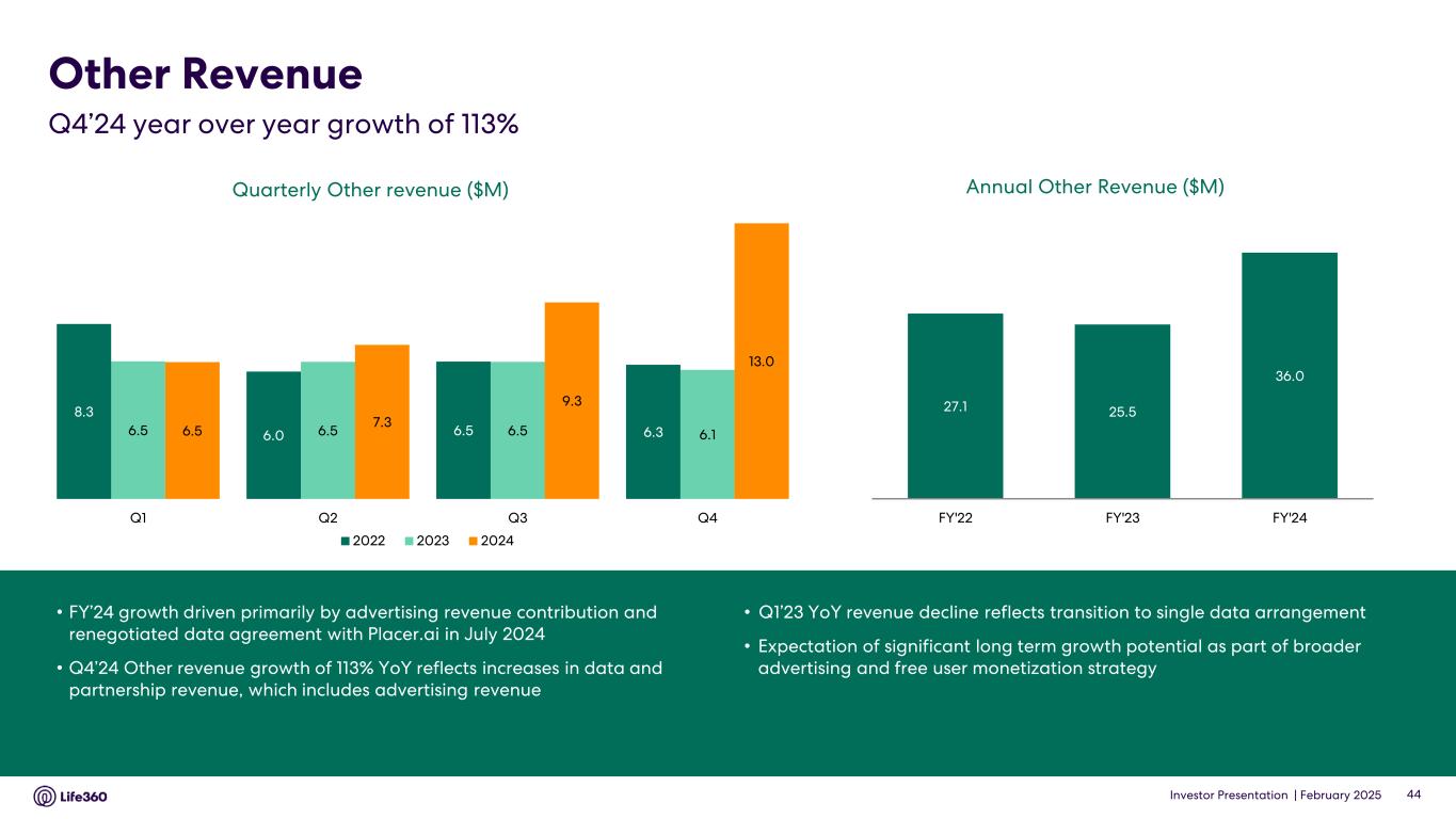 Investor Presentation | February 2025 Hardware Revenue Q4’24 year over year growth of 13% *Q1’22 revenue is adjusted and includes Tile revenue pre-acquisition. Quarterly Hardware revenue ($M)* 43 • Q4’24 hardware revenue increase of 13% YoY, primarily driven by reduced returns and discounts offered, as well as an increase in units shipped and a shift in channel mix • Strategic decision to launch product refresh in September 2024 to incorporate essential functional and packaging updates • Continued focus on supporting strong demand for new Tile lineup and expanding user base, with Life360 branding in physical retail stores on a global basis for the first time 10.5 6.8 11.7 19.6 10.0 11.6 15.5 21.1 10.2 11.9 11.7 23.8 Q1 Q2 Q3 Q4 2022 2023 2024 Annual Hardware revenue ($M) 47.9 58.2 57.6 FY'22 FY'23 FY'24