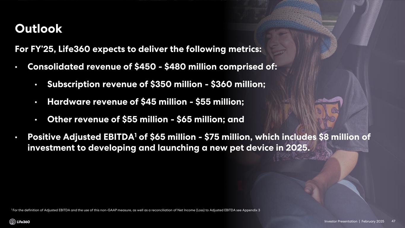 Investor Presentation | February 2025 1 For the definition of Adjusted EBITDA and the use of this non-GAAP measure, as well as a reconciliation of Net Income (Loss) to Adjusted EBITDA see Appendix 3 Outlook 47 For FY’25, Life360 expects to deliver the following metrics: • Consolidated revenue of $450 - $480 million comprised of: • Subscription revenue of $350 million - $360 million; • Hardware revenue of $45 million - $55 million; • Other revenue of $55 million - $65 million; and • Positive Adjusted EBITDA1 of $65 million - $75 million, which includes $8 million of investment to developing and launching a new pet device in 2025. Investor Presentation |