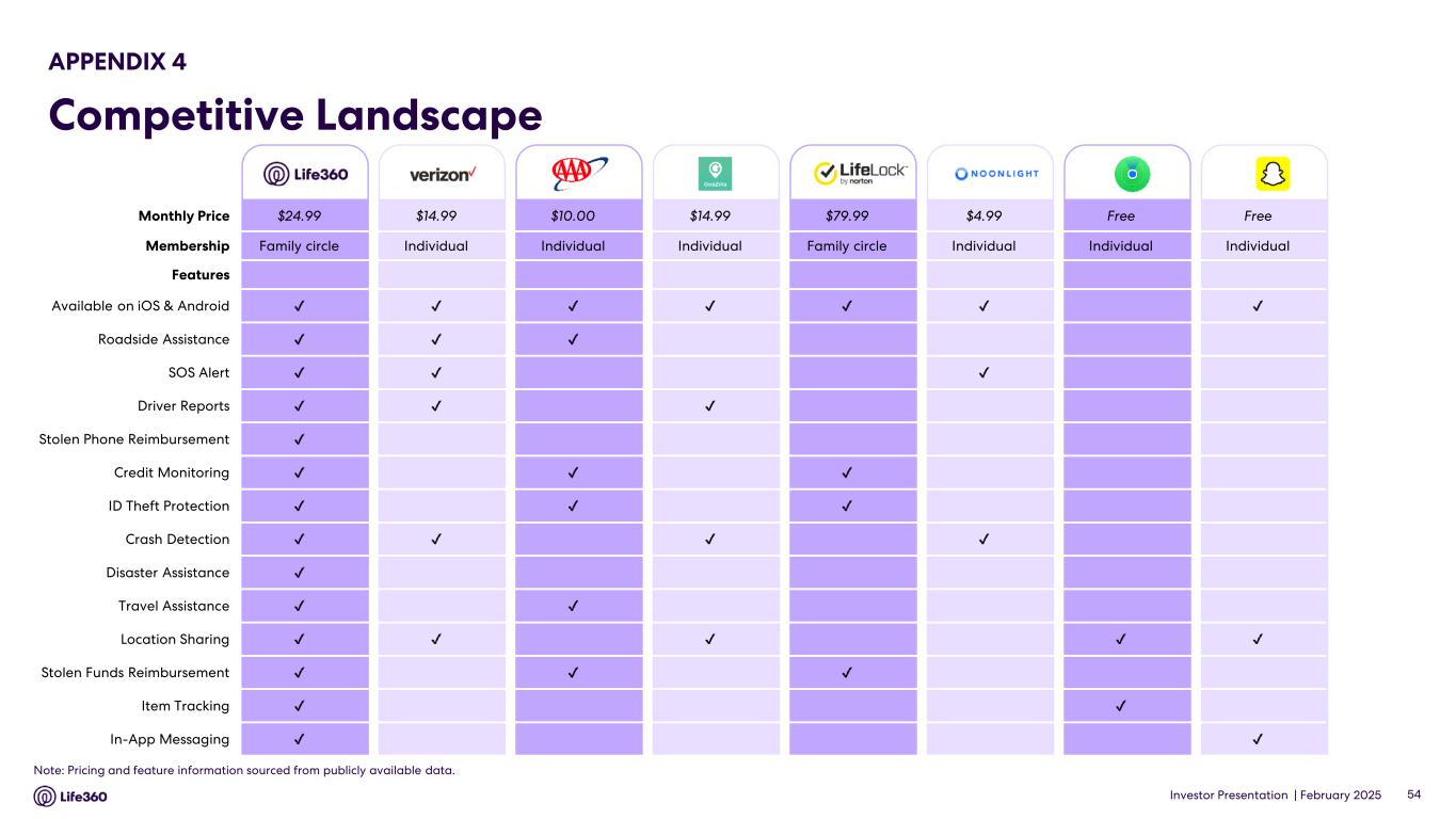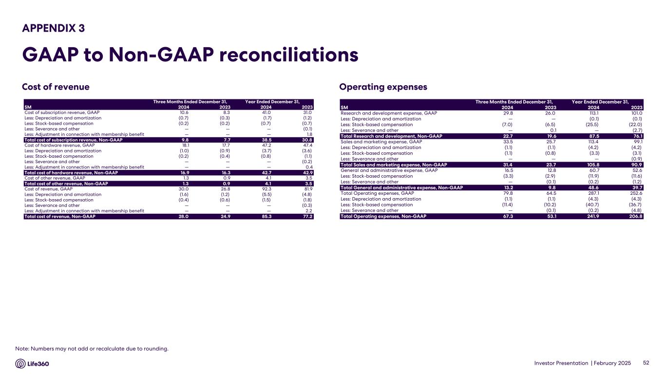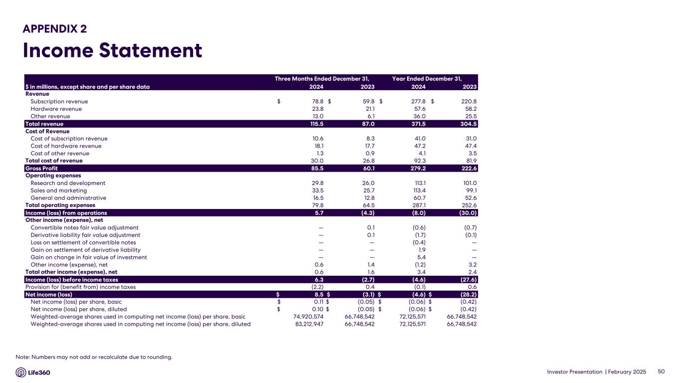 Investor Presentation | February 2025 APPENDIX 1 Operating Metrics 1 Core metrics relate solely to the Life360 mobile application. 2 Core subscription revenue is defined as subscription revenue derived from the Life360 mobile application and excludes non-core subscription revenue which relates to other hardware related subscription offerings. Beginning with the second quarter of 2024, this definition has been updated and calculated in accordance with GAAP. 49 (in millions, except ARPPC, ARPPS, ASP) Q4 2024 Q3 2024 Q2 2024 Q1 2024 Q4 2023 Q3 2023 Life360 Core(1) Monthly Active Users (MAU) - Global 79.6 76.9 70.6 66.4 61.4 58.4 U.S. 43.7 42.2 40.5 38.8 36.8 35.4 International 36.0 34.7 30.1 27.5 24.6 23.0 ANZ 2.7 2.5 2.4 2.2 2.0 1.9 Paying Circles - Total 2.3 2.2 2.0 1.9 1.8 1.7 U.S. 1.6 1.6 1.5 1.4 1.3 1.3 International 0.6 0.6 0.6 0.5 0.5 0.4 Average Revenue per Paying Circle (ARPPC) $ 131.76 $ 127.57 $ 125.96 $ 123.97 $ 124.17 $ 119.97 Life360 Consolidated Subscriptions 2.9 2.8 2.7 2.5 2.4 2.3 Average Revenue per Paying Subscription (ARPPS) $ 110.43 $ 106.27 $ 104.00 $ 102.02 $ 102.17 $ 101.33 Net hardware units shipped 1.8 0.8 0.7 0.5 1.7 1.1 Average Sale Price (ASP) $ 12.56 $ 12.69 $ 15.92 $ 16.50 $ 11.50 $ 13.24 Annualized Monthly Revenue (AMR) $ 367.6 $ 336.2 $ 304.8 $ 284.7 $ 274.1 $ 259.1 Additional KPI Related Information Subscription revenue $ 78.8 $ 71.8 $ 65.7 $ 61.6 $ 59.8 $ 56.6 Non-Core subscription revenue $ (5.7) $ (5.6) $ (5.5) $ (5.8) $ (5.9) $ (7.2) Core subscription revenue(2) $ 73.1 $ 66.2 $ 60.2 $ 55.8 $ 53.9 $ 49.4 Subscription revenue bundling related adjustment $ (0.6) $ (1.4) $ (1.3) $ (1.2) $ (1.2) $ (1.2) Hardware revenue bundling related adjustment $ 0.4 $ 1.4 $ 1.3 $ 1.2 $ 1.2 $ 1.4