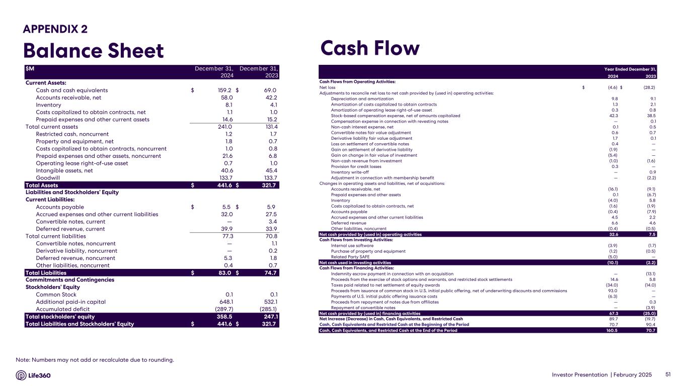 Investor Presentation | February 2025 APPENDIX 2 Income Statement 50 Note: Numbers may not add or recalculate due to rounding. Three Months Ended December 31, Year Ended December 31, $ in millions, except share and per share data 2024 2023 2024 2023 Revenue Subscription revenue $ 78.8 $ 59.8 $ 277.8 $ 220.8 Hardware revenue 23.8 21.1 57.6 58.2 Other revenue 13.0 6.1 36.0 25.5 Total revenue 115.5 87.0 371.5 304.5 Cost of Revenue Cost of subscription revenue 10.6 8.3 41.0 31.0 Cost of hardware revenue 18.1 17.7 47.2 47.4 Cost of other revenue 1.3 0.9 4.1 3.5 Total cost of revenue 30.0 26.8 92.3 81.9 Gross Profit 85.5 60.1 279.2 222.6 Operating expenses Research and development 29.8 26.0 113.1 101.0 Sales and marketing 33.5 25.7 113.4 99.1 General and administrative 16.5 12.8 60.7 52.6 Total operating expenses 79.8 64.5 287.1 252.6 Income (loss) from operations 5.7 (4.3) (8.0) (30.0) Other income (expense), net Convertible notes fair value adjustment — 0.1 (0.6) (0.7) Derivative liability fair value adjustment — 0.1 (1.7) (0.1) Loss on settlement of convertible notes — — (0.4) — Gain on settlement of derivative liability — — 1.9 — Gain on change in fair value of investment — — 5.4 — Other income (expense), net 0.6 1.4 (1.2) 3.2 Total other income (expense), net 0.6 1.6 3.4 2.4 Income (loss) before income taxes 6.3 (2.7) (4.6) (27.6) Provision for (benefit from) income taxes (2.2) 0.4 (0.1) 0.6 Net income (loss) $ 8.5 $ (3.1) $ (4.6) $ (28.2) Net income (loss) per share, basic $ 0.11 $ (0.05) $ (0.06) $ (0.42) Net income (loss) per share, diluted $ 0.10 $ (0.05) $ (0.06) $ (0.42) Weighted-average shares used in computing net income (loss) per share, basic 74,920,574 66,748,542 72,125,571 66,748,542 Weighted-average shares used in computing net income (loss) per share, diluted 83,212,947 66,748,542 72,125,571 66,748,542