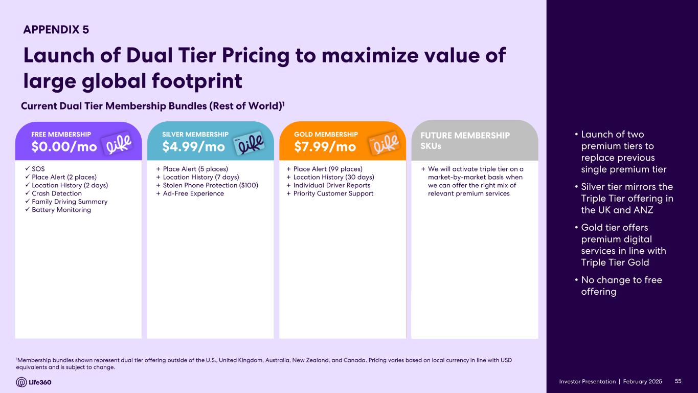 Investor Presentation | February 2025 1Membership bundles shown represent dual tier offering outside of the U.S., United Kingdom, Australia, New Zealand, and Canada. Pricing varies based on local currency in line with USD equivalents and is subject to change. ✓ SOS ✓ Place Alert (2 places) ✓ Location History (2 days) ✓ Crash Detection ✓ Family Driving Summary ✓ Battery Monitoring + Place Alert (5 places) + Location History (7 days) + Stolen Phone Protection ($100) + Ad-Free Experience + Place Alert (99 places) + Location History (30 days) + Individual Driver Reports + Priority Customer Support Current Dual Tier Membership Bundles (Rest of World)1 FREE MEMBERSHIP $0.00/mo SILVER MEMBERSHIP $4.99/mo GOLD MEMBERSHIP $7.99/mo + We will activate triple tier on a market-by-market basis when we can offer the right mix of relevant premium services FUTURE MEMBERSHIP SKUs 55 • Launch of two premium tiers to replace previous single premium tier • Silver tier mirrors the Triple Tier offering in the UK and ANZ • Gold tier offers premium digital services in line with Triple Tier Gold • No change to free offering Investor Presentation | APPENDIX 5 Launch of Dual Tier Pricing to maximize value of large global footprint