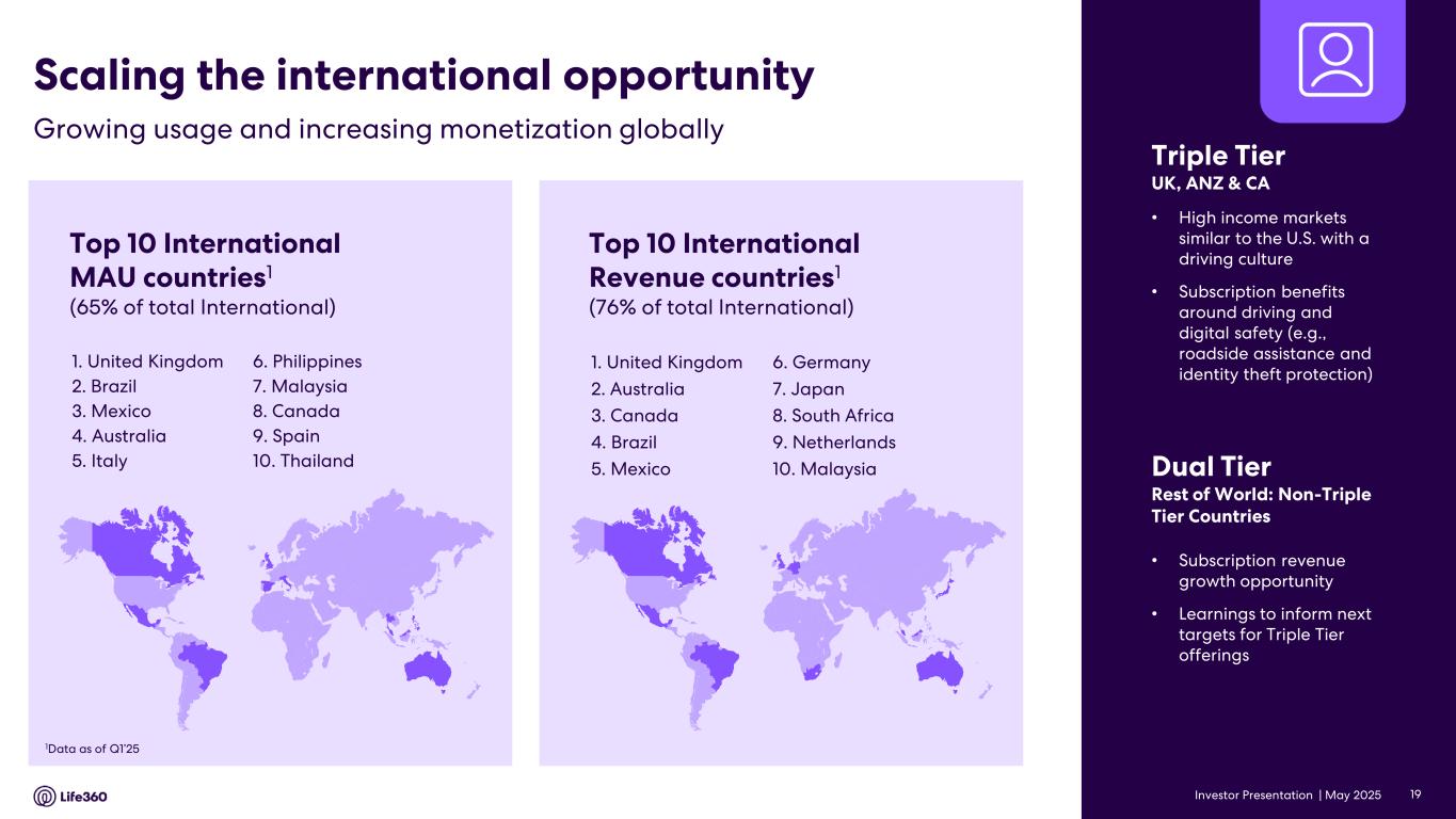Investor Presentation | May 2025 1As of March 31, 2025. Note: Membership bundles shown represent U.S. offering. Services differ slightly by region. Loyal and engaged user base enables monetization through Triple Tier membership Current Triple Tier Membership Bundles (US, UK, Canada, ANZ) + Place Alert (5 places) + Location History (7 days) + Stolen Phone Protection ($100) + Ad-Free Experience 13% of US Paying Circles1 SILVER MEMBERSHIP $7.99/mo + Place Alert (99 places) + Location History (30 days) + Individual Driver Reports + Roadside Assistance + 24/7 Emergency Dispatch + ID Theft Protection + Free Towing (5mi Radius) + Stolen Funds Reimbursement ($25K) + Stolen Phone Protection ($250) 83% of US Paying Circles1 GOLD MEMBERSHIP $14.99/mo + Credit Monitoring + Disaster Response + Medical Assistance + Travel Support + Free Towing (50mi Radius) + Stolen Funds Reimbursement ($1M) + Stolen Phone Protection ($500) 4% of US Paying Circles1 PLATINUM MEMBERSHIP $24.99/mo ✓ SOS ✓ Place Alert (2 places) ✓ Location History (2 days) ✓ Crash Detection ✓ Family Driving Summary ✓ Battery Monitoring FREE MEMBERSHIP $0.00/mo 18