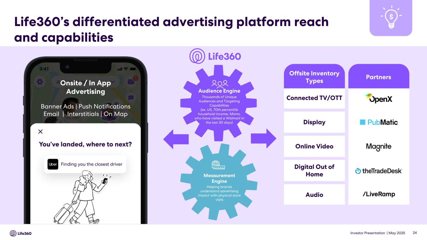 Investor Presentation | May 2025 High value offsite and direct sales advertising are differentiators for Life360’s advertising model 23 The Future New & Expanded Sales Channels + Improved Ad Relevance, Data and Delivery + Expanded Ad Formats / Surfaces = Long-term Revenue and Value Driving Higher Average Revenue Per User Over Time Third party sales teams, Programmatic relationships Ad Testing & Infrastructure Development Paid Partnerships Pursue paid partnerships in parallel to programmatic ads Direct Sales Expand direct sales efforts while continuing to leverage programmatic ads Offsite Explore offsite (retargeting) opportunities to help brands connect with our members A v e ra g e R e v e n u e P e r U se r Strategic acquisition of AdTech AI platform for enhanced targeting capabilities