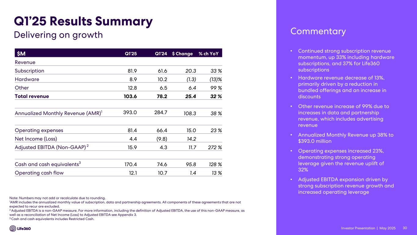Investor Presentation | May 2025 • Continued strong subscription revenue momentum, up 33% including hardware subscriptions, and 37% for Life360 subscriptions • Hardware revenue decrease of 13%, primarily driven by a reduction in bundled offerings and an increase in discounts • Other revenue increase of 99% due to increases in data and partnership revenue, which includes advertising revenue • Annualized Monthly Revenue up 38% to $393.0 million • Operating expenses increased 23%, demonstrating strong operating leverage given the revenue uplift of 32% • Adjusted EBITDA expansion driven by strong subscription revenue growth and increased operating leverage $M Q1’25 Q1’24 $ Change % ch YoY Revenue Subscription 81.9 61.6 20.3 33 % Hardware 8.9 10.2 (1.3) (13)% Other 12.8 6.5 6.4 99 % Total revenue 103.6 78.2 25.4 32 % Annualized Monthly Revenue (AMR)1 393.0 284.7 108.3 38 % Operating expenses 81.4 66.4 15.0 23 % Net Income (Loss) 4.4 (9.8) 14.2 Adjusted EBITDA (Non-GAAP) 2 15.9 4.3 11.7 272 % Cash and cash equivalents3 170.4 74.6 95.8 128 % Operating cash flow 12.1 10.7 1.4 13 % Note: Numbers may not add or recalculate due to rounding. 1AMR includes the annualized monthly value of subscription, data and partnership agreements. All components of these agreements that are not expected to recur are excluded. 2 Adjusted EBITDA is a non-GAAP measure. For more information, including the definition of Adjusted EBITDA, the use of this non-GAAP measure, as well as a reconciliation of Net Income (Loss) to Adjusted EBITDA see Appendix 3. 3 Cash and cash equivalents includes Restricted Cash. Q1’25 Results Summary CommentaryDelivering on growth 30Investor Presentation |