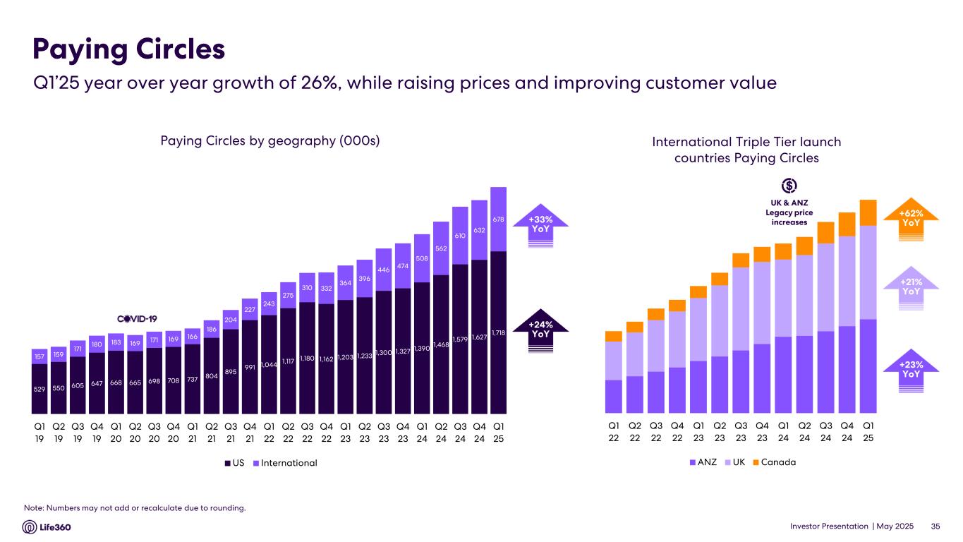 Investor Presentation | May 2025 Subscription Revenue Consolidated Quarterly Subscription revenue ($M) Global Paying Circles and Global ARPPC • Strong subscription growth across U.S. and international, with consolidated subscription revenue uplift of 33% YoY in Q1’25 including the contribution of hardware subscriptions • Core Life360 subscription revenue growth of 37% YoY in Q1’25, benefitting from strong Paying Circles growth of 26% YoY • Core Life360 Subscription revenue growth also supported by price increases in the U.S. for new and existing subscribers and a shift in product mix towards higher priced products • Additional uplift from international regions due to legacy subscriber price increases and the launch of Dual Tier in non-Triple Tier markets, as well as legacy subscriber price increases in the Triple Tier UK and ANZ markets 33% revenue growth underpinned by 26% YoY uplift in Paying Circles and 8% YoY increase in ARPPC 34 51.7 52.7 56.6 59.861.6 65.7 71.8 78.881.9 Q1 Q2 Q3 Q4 2023 2024 2025 1,898 2,030 2,189 2,258 2,396 $124 $126 $128 $132 $133 $120 $122 $124 $126 $128 $130 $132 $134 $136 1,500 1,600 1,700 1,800 1,900 2,000 2,100 2,200 2,300 2,400 2,500 Q1 24 Q2 24 Q3 24 Q4 24 Q1 25 Global PC Global ARPPC