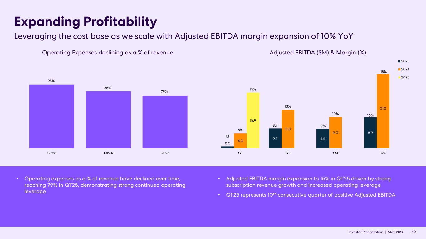 Investor Presentation | May 2025 Expanding Profitability Leveraging the cost base as we scale with Adjusted EBITDA margin expansion of 10% YoY 40Investor Presentation | Adjusted EBITDA ($M) & Margin (%)Operating Expenses declining as a % of revenue 7% • Operating expenses as a % of revenue have declined over time, reaching 79% in Q1’25, demonstrating strong continued operating leverage • Adjusted EBITDA margin expansion to 15% in Q1’25 driven by strong subscription revenue growth and increased operating leverage • Q1’25 represents 10th consecutive quarter of positive Adjusted EBITDA 95% 85% 79% Q1'23 Q1'24 Q1'25 0.5 5.7 5.5 8.9 4.3 11.0 9.0 21.2 15.9 Q1 Q2 Q3 Q4 2023 2024 2025 1% 8% 7% 10% 5% 13% 10% 18% 15%