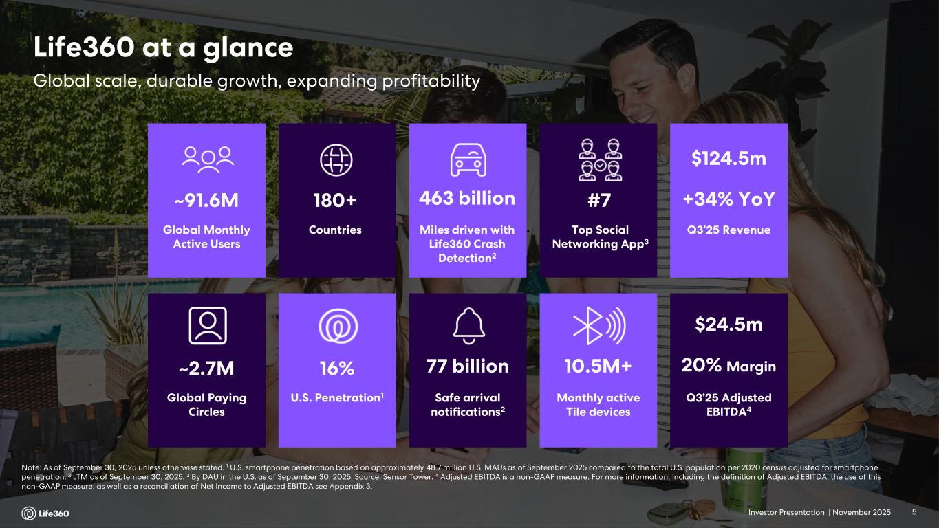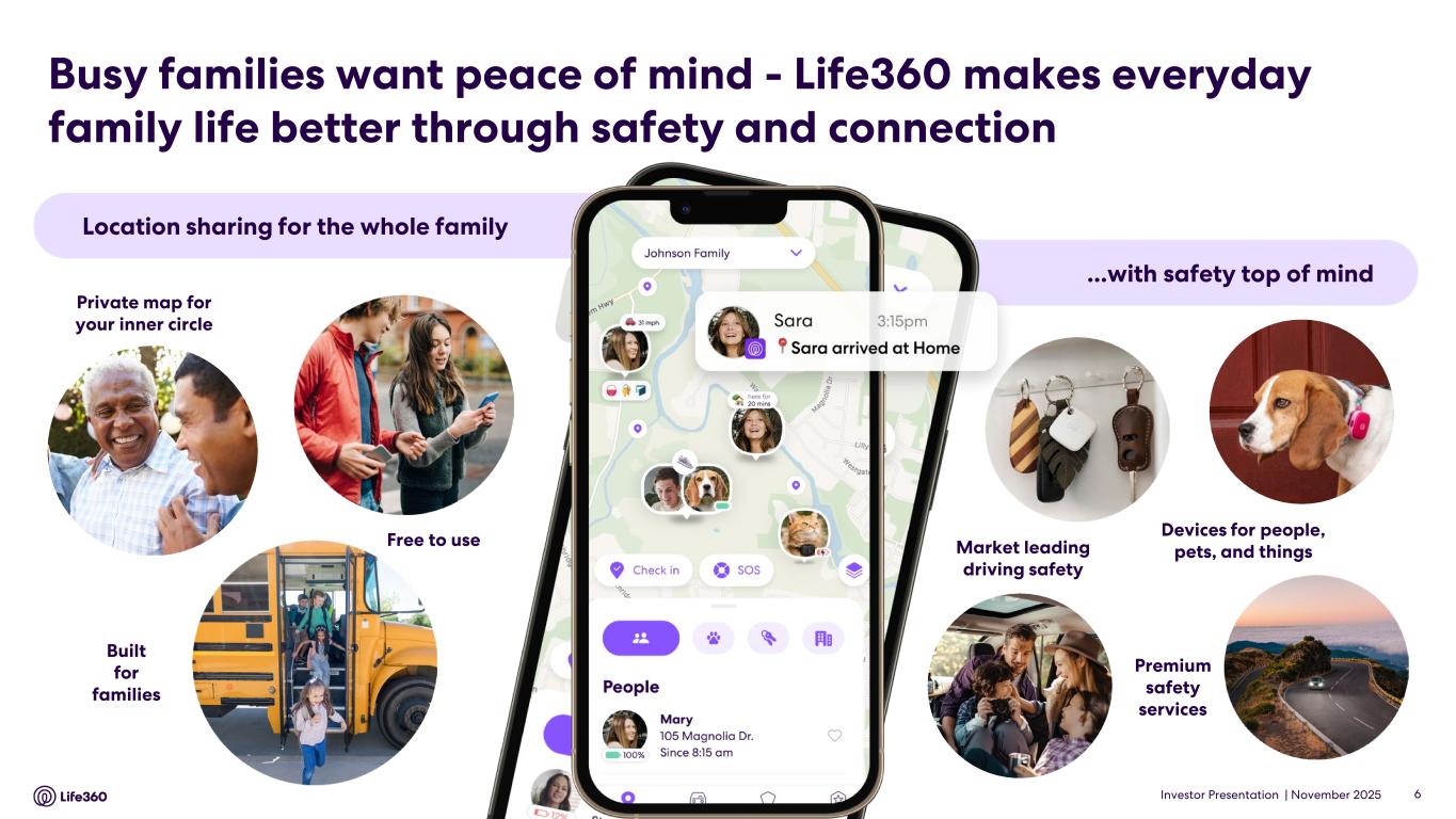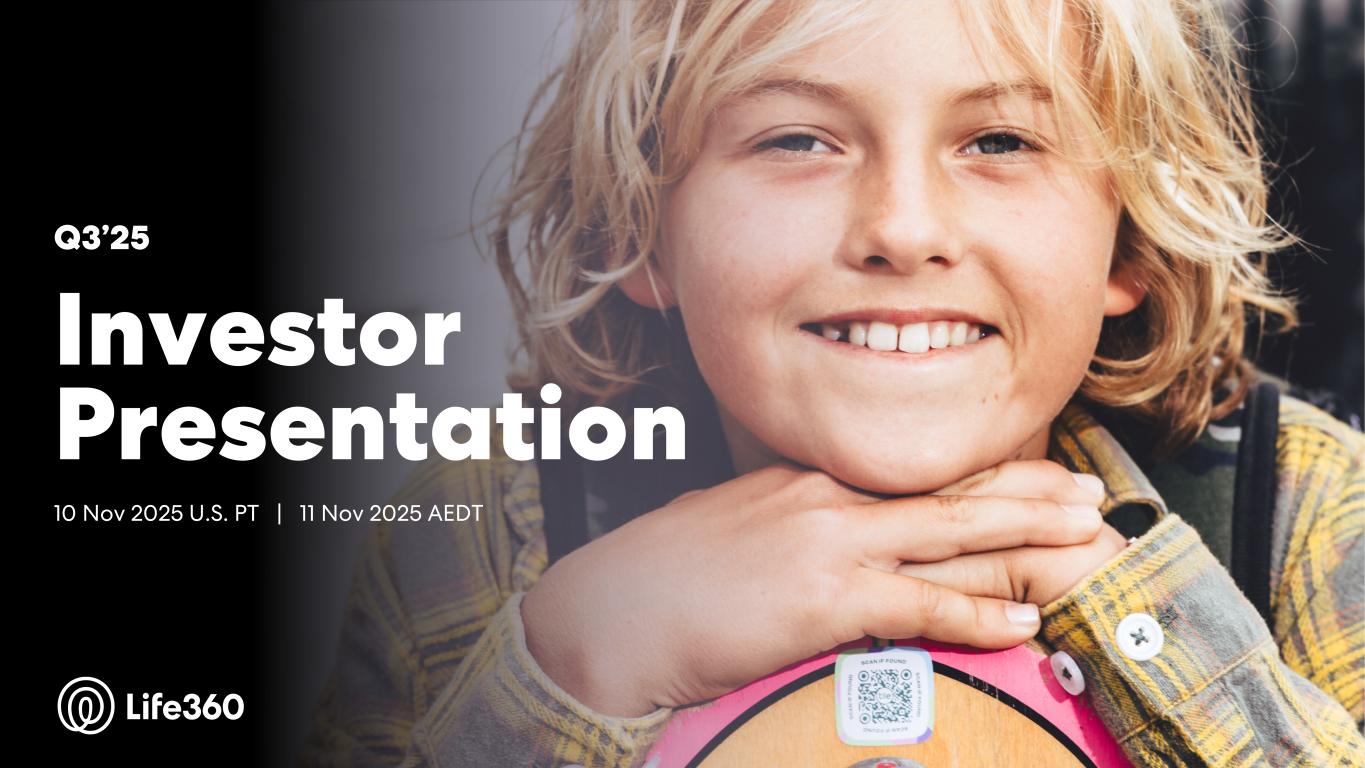 Investor Presentation | November 2025 DISCLAIMER These materials and the accompanying oral presentation have been prepared by Life360, Inc. (ARBN 629 412 942) (“Company”) on a confidential and non-reliance basis, and may not be reproduced in whole or in part, nor may any of its contents be disclosed, to any other person, without the prior written consent of the Company. These materials are for informational purposes only. This presentation contains summary information about the Company and its activities and is current as of the date of this presentation. This presentation does not purport to be all-inclusive or to contain all of the information you may desire. It should be read in conjunction with the Company’s periodic and continuous disclosure announcements filed with the Australian Securities Exchange and the U.S. Securities and Exchange Commission (“SEC”), available at www.asx.com.au and www.sec.gov, respectively. These materials do not constitute an offer, invitation, solicitation or recommendation with respect to the purchase or sale of any security in the Company or interest therein nor does it constitute financial product advice. These materials are not a prospectus, product disclosure statement or other offer document under Australian law or under any other law. These materials have not been filed, registered or approved by regulatory authorities in any jurisdiction. This communication is restricted by law; it is not intended for distribution to, or use by any person in, any jurisdiction where such distribution or use would be contrary to local law or regulation. The information contained in these materials is not intended to be relied upon as advice or a recommendation to investors and is not intended to form the basis of any investment decision in the Company’s securities. The information does not take into account the investment objectives, financial situation, taxation situation or needs of any particular investor. An investor must not act on the basis of any matter contained in these materials but must make its own assessment of the Company and conduct its own investigations and analysis. Investors should assess their own individual financial circumstances and consider talking to a financial adviser, professional adviser or consultant before making any investment decision. By reading these materials you agree to be bound by the limitations set out in these materials. No representation or warranty, express or implied, is made as to the accuracy, reliability, completeness or fairness of the information, opinions, forecasts, reports, estimates and conclusions contained in these materials. The Company does not undertake any obligation to provide any additional information nor update or revise the information in these materials nor correct any inaccuracies or omissions. To the maximum extent permitted by law, none of the Company and its related bodies corporate, or their respective directors, employees or agents, nor any other person accepts any responsibility nor any liability for loss arising from the use of or reliance on information contained in these materials or otherwise arising in connection with it, nor in relation to any other written or oral information or opinions provided now or in the future to the recipient or its advisers and representatives, including without limitation any liability from fault of negligence. Past performance is not indicative of future performance and no guarantee of future returns is implied or given. Nothing contained in these materials nor any information made available to you is, or shall be relied upon as, a promise, representation, warranty or guarantee as to the past, present or the future performance of the Company. Certain statements in these materials constitute forward-looking statements within the meaning of the Private Securities Litigation Reform Act of 1995 (“PLSRA”), Section 27A of the Securities Act of 1933, as amended, and Section 21E of the Securities Exchange Act of 1934, as amended (the “Exchange Act”). Statements that are not historical in nature, including the words “anticipate”, “expect”, “suggests”, “plan”, “believe”, “intend”, “estimates”, “targets”, “projects”, “should”, “could”, “would”, “may”, “will”, “forecast,” “opportunity,” “goal,” “vision,” “outlook” and other similar expressions are intended to identify forward-looking statements. These forward- looking statements include, but are not limited to, statements regarding: the Company’s growth strategy and business plan and the Company’s ability to effectively manage its growth and meet future capital requirements; the Company’s expectations regarding future financial performance, including its expectations regarding its revenue, revenue growth, adjusted EBITDA, and operating cash flow, and the Company’s ability to achieve or maintain future profitability; the Company’s ability to further penetrate its existing member base, maintain and expand its member base and increase monetization of its member base; the Company’s ability to expand internationally and the significance of its global opportunity; the Company’s ability to anticipate market needs or develop new products and services or enhance existing products and services to meet those needs; the Company’s ability to increase sales of its products and services; and the Company’s proposed acquisition of Nativo, its expected timing and completion, the anticipated benefits and synergies of the transaction, and the potential impact on the Company’s business strategy, financial condition, and growth prospects. Such forward-looking statements are prediction, projections and other statements about future events that are based on current expectations and assumptions and, as a result, involve known and unknown risks, uncertainties, assumptions and other important factors, many of which are beyond the contro