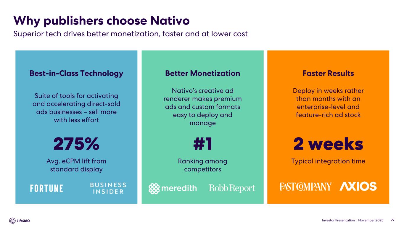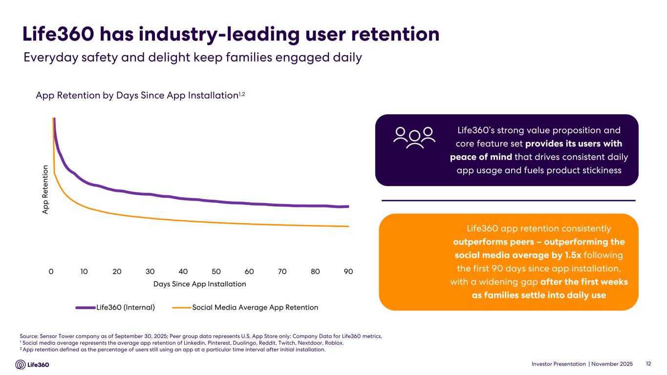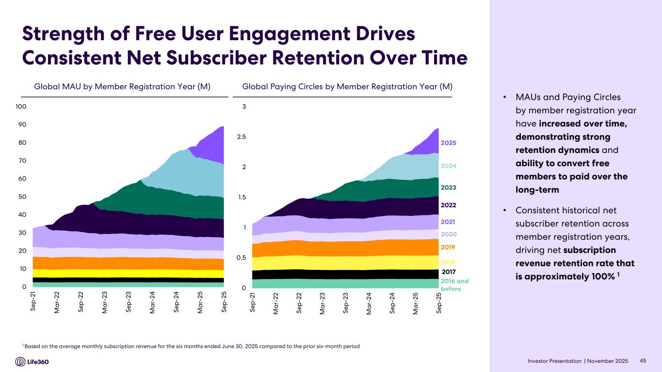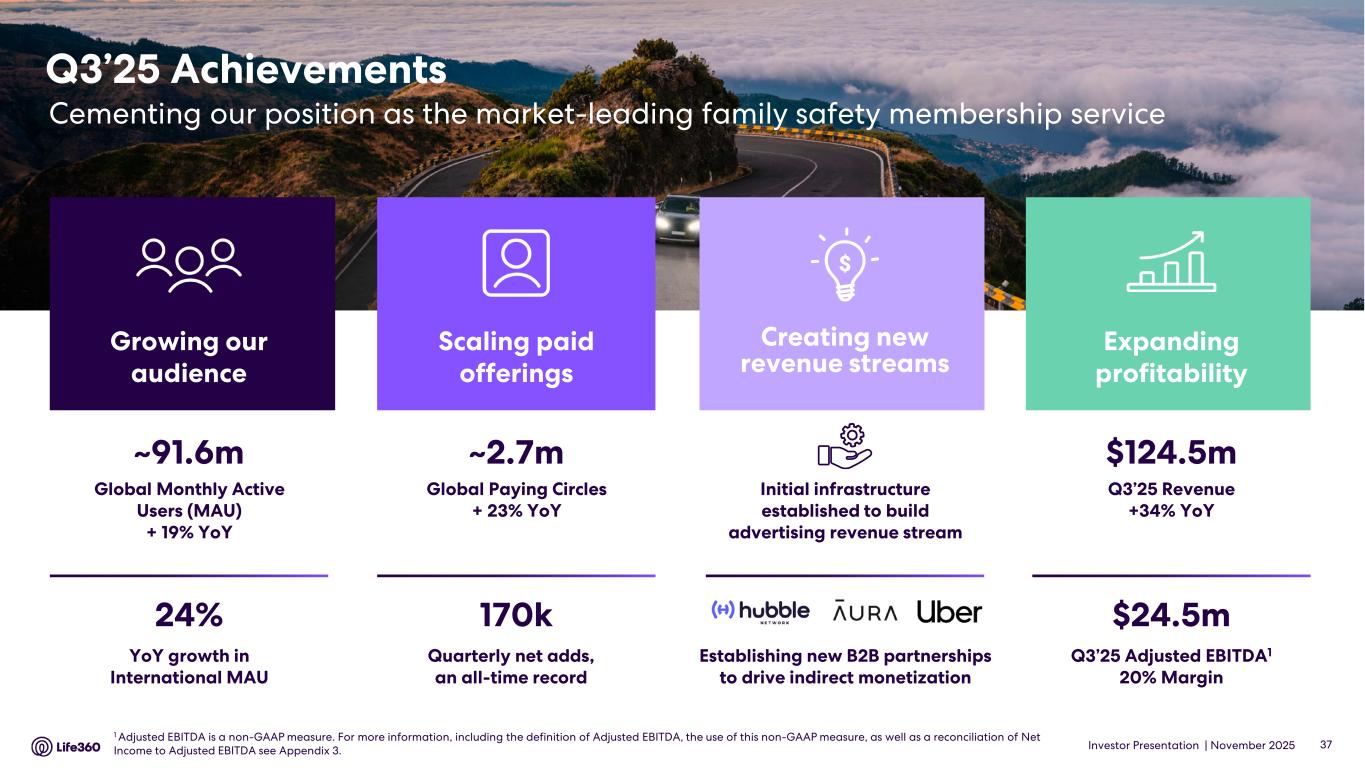 Investor Presentation | November 2025 DISCLAIMER These materials and the accompanying oral presentation have been prepared by Life360, Inc. (ARBN 629 412 942) (“Company”) on a confidential and non-reliance basis, and may not be reproduced in whole or in part, nor may any of its contents be disclosed, to any other person, without the prior written consent of the Company. These materials are for informational purposes only. This presentation contains summary information about the Company and its activities and is current as of the date of this presentation. This presentation does not purport to be all-inclusive or to contain all of the information you may desire. It should be read in conjunction with the Company’s periodic and continuous disclosure announcements filed with the Australian Securities Exchange and the U.S. Securities and Exchange Commission (“SEC”), available at www.asx.com.au and www.sec.gov, respectively. These materials do not constitute an offer, invitation, solicitation or recommendation with respect to the purchase or sale of any security in the Company or interest therein nor does it constitute financial product advice. These materials are not a prospectus, product disclosure statement or other offer document under Australian law or under any other law. These materials have not been filed, registered or approved by regulatory authorities in any jurisdiction. This communication is restricted by law; it is not intended for distribution to, or use by any person in, any jurisdiction where such distribution or use would be contrary to local law or regulation. The information contained in these materials is not intended to be relied upon as advice or a recommendation to investors and is not intended to form the basis of any investment decision in the Company’s securities. The information does not take into account the investment objectives, financial situation, taxation situation or needs of any particular investor. An investor must not act on the basis of any matter contained in these materials but must make its own assessment of the Company and conduct its own investigations and analysis. Investors should assess their own individual financial circumstances and consider talking to a financial adviser, professional adviser or consultant before making any investment decision. By reading these materials you agree to be bound by the limitations set out in these materials. No representation or warranty, express or implied, is made as to the accuracy, reliability, completeness or fairness of the information, opinions, forecasts, reports, estimates and conclusions contained in these materials. The Company does not undertake any obligation to provide any additional information nor update or revise the information in these materials nor correct any inaccuracies or omissions. To the maximum extent permitted by law, none of the Company and its related bodies corporate, or their respective directors, employees or agents, nor any other person accepts any responsibility nor any liability for loss arising from the use of or reliance on information contained in these materials or otherwise arising in connection with it, nor in relation to any other written or oral information or opinions provided now or in the future to the recipient or its advisers and representatives, including without limitation any liability from fault of negligence. Past performance is not indicative of future performance and no guarantee of future returns is implied or given. Nothing contained in these materials nor any information made available to you is, or shall be relied upon as, a promise, representation, warranty or guarantee as to the past, present or the future performance of the Company. Certain statements in these materials constitute forward-looking statements within the meaning of the Private Securities Litigation Reform Act of 1995 (“PLSRA”), Section 27A of the Securities Act of 1933, as amended, and Section 21E of the Securities Exchange Act of 1934, as amended (the “Exchange Act”). Statements that are not historical in nature, including the words “anticipate”, “expect”, “suggests”, “plan”, “believe”, “intend”, “estimates”, “targets”, “projects”, “should”, “could”, “would”, “may”, “will”, “forecast,” “opportunity,” “goal,” “vision,” “outlook” and other similar expressions are intended to identify forward-looking statements. These forward- looking statements include, but are not limited to, statements regarding: the Company’s growth strategy and business plan and the Company’s ability to effectively manage its growth and meet future capital requirements; the Company’s expectations regarding future financial performance, including its expectations regarding its revenue, revenue growth, adjusted EBITDA, and operating cash flow, and the Company’s ability to achieve or maintain future profitability; the Company’s ability to further penetrate its existing member base, maintain and expand its member base and increase monetization of its member base; the Company’s ability to expand internationally and the significance of its global opportunity; the Company’s ability to anticipate market needs or develop new products and services or enhance existing products and services to meet those needs; the Company’s ability to increase sales of its products and services; and the Company’s proposed acquisition of Nativo, its expected timing and completion, the anticipated benefits and synergies of the transaction, and the potential impact on the Company’s business strategy, financial condition, and growth prospects. Such forward-looking statements are prediction, projections and other statements about future events that are based on current expectations and assumptions and, as a result, involve known and unknown risks, uncertainties, assumptions and other important factors, many of which are beyond the contro