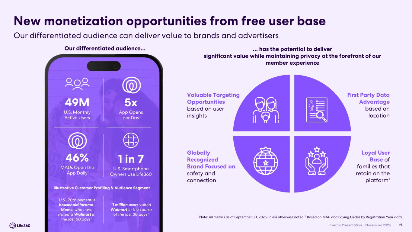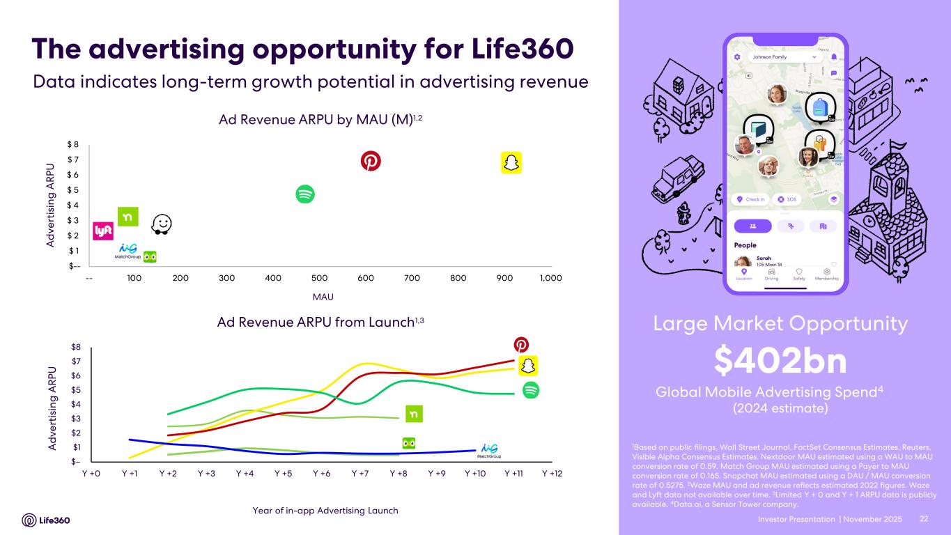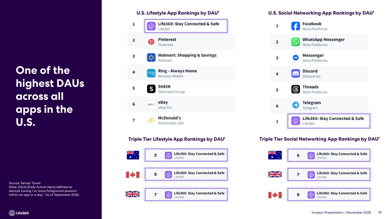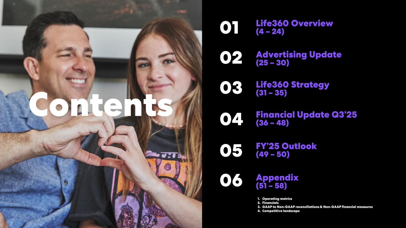 Investor Presentation | November 2025 3 Life360 Overview (4 – 24) Financial Update Q3’25 (30 – 42)Contents FY’25 Outlook (43 – 44) 1. 2. 3. 4. Appendix (45 – 52) Operating metrics Financials GAAP to Non-GAAP reconciliations & Non-GAAP financial measures Competitive landscape Life360 Strategy (25 – 29)02 01 04 03 05 1. 2. 3. 4. Appendix (51 – 58) Operating metrics Financials GAAP to Non-GAAP reconciliations & Non-GAAP financial measures Competitive landscape 06 FY’25 Outlook (49 – 50)05 Financial Update Q3’25 (36 – 48)04 Life360 Strategy (31 – 35)03 Advertising Update (25 – 30)02 Life360 Overview (4 – 24)01