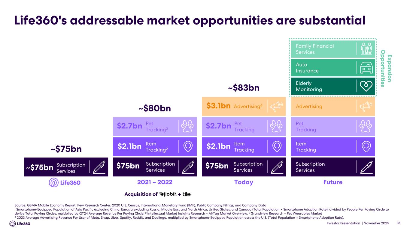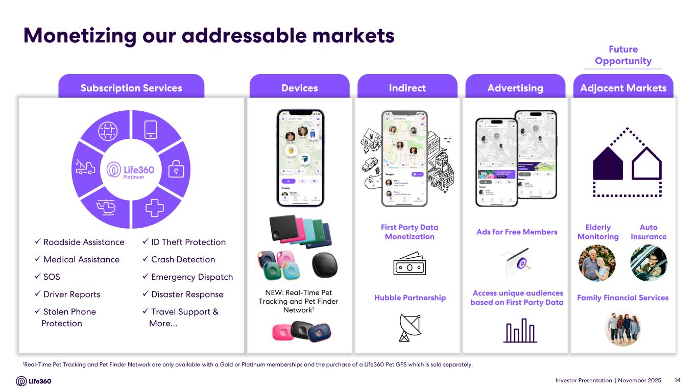 Investor Presentation | November 2025 Life360's addressable market opportunities are substantial Source: GSMA Mobile Economy Report, Pew Research Center, 2020 U.S. Census, International Monetary Fund (IMF), Public Company Filings, and Company Data 1 Smartphone-Equipped Population of Asia Pacific excluding China, Eurasia excluding Russia, Middle East and North Africa, United States, and Canada (Total Population × Smartphone Adoption Rate), divided by People Per Paying Circle to derive Total Paying Circles, multiplied by Q1’24 Average Revenue Per Paying Circle. 2 Intellectual Market Insights Research – AirTag Market Overview. 3 Grandview Research – Pet Wearables Market 4 2023 Average Advertising Revenue Per User of Meta, Snap, Uber, Spotify, Reddit, and Duolingo, multiplied by Smartphone-Equipped Population across the U.S. (Total Population × Smartphone Adoption Rate). 13 2021 – 2022 ~$80bn Item Tracking2 Pet Tracking3 Subscription Services $2.7bn $2.1bn $75bn Today ~$83bn Advertising4 Item Tracking Pet Tracking Subscription Services $2.7bn $2.1bn $75bn $3.1bn Subscription Services1 ~$75bn ~$75bn Acquisition of + Future Exp a nsion O p p ortunities Family Financial Services Elderly Monitoring Auto Insurance Advertising Item Tracking Pet Tracking Subscription Services