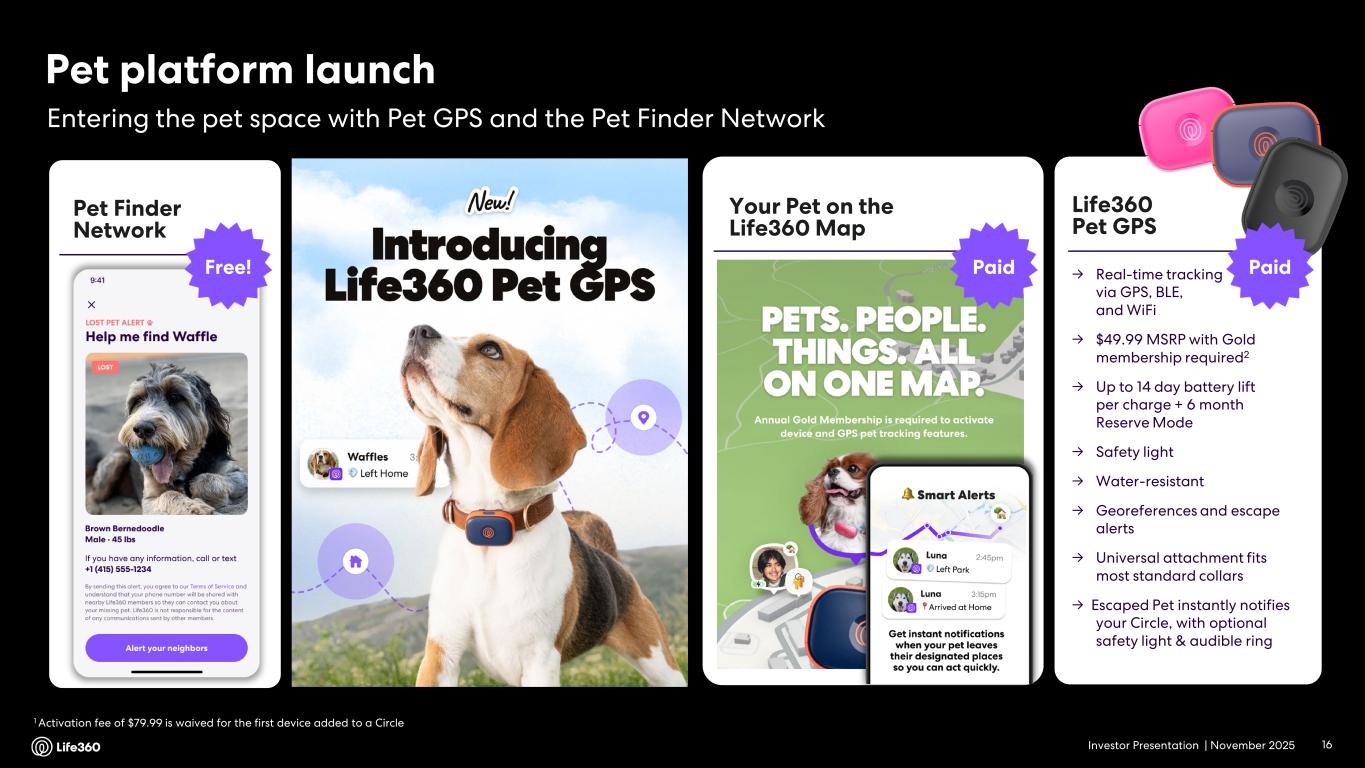 Investor Presentation | November 2025 Life360 Pet GPS → Real-time tracking via GPS, BLE, and WiFi → $49.99 MSRP with Gold membership required2 → Up to 14 day battery lift per charge + 6 month Reserve Mode → Safety light → Water-resistant → Georeferences and escape alerts → Universal attachment fits most standard collars → Escaped Pet instantly notifies your Circle, with optional safety light & audible ring Pet platform launch Entering the pet space with Pet GPS and the Pet Finder Network 1 Activation fee of $79.99 is waived for the first device added to a Circle 16 Your Pet on the Life360 Map Pet Finder Network Free! Paid Paid