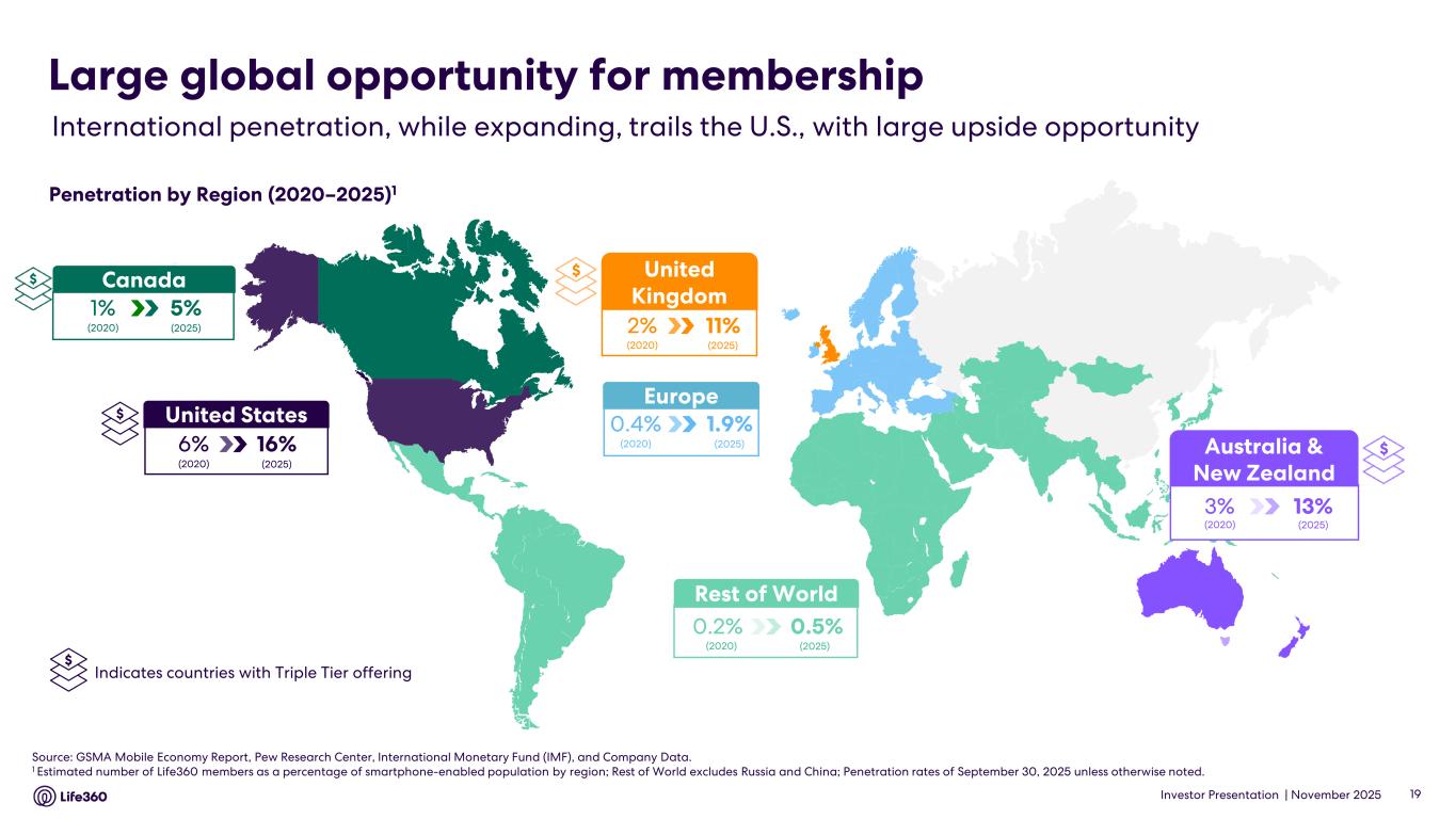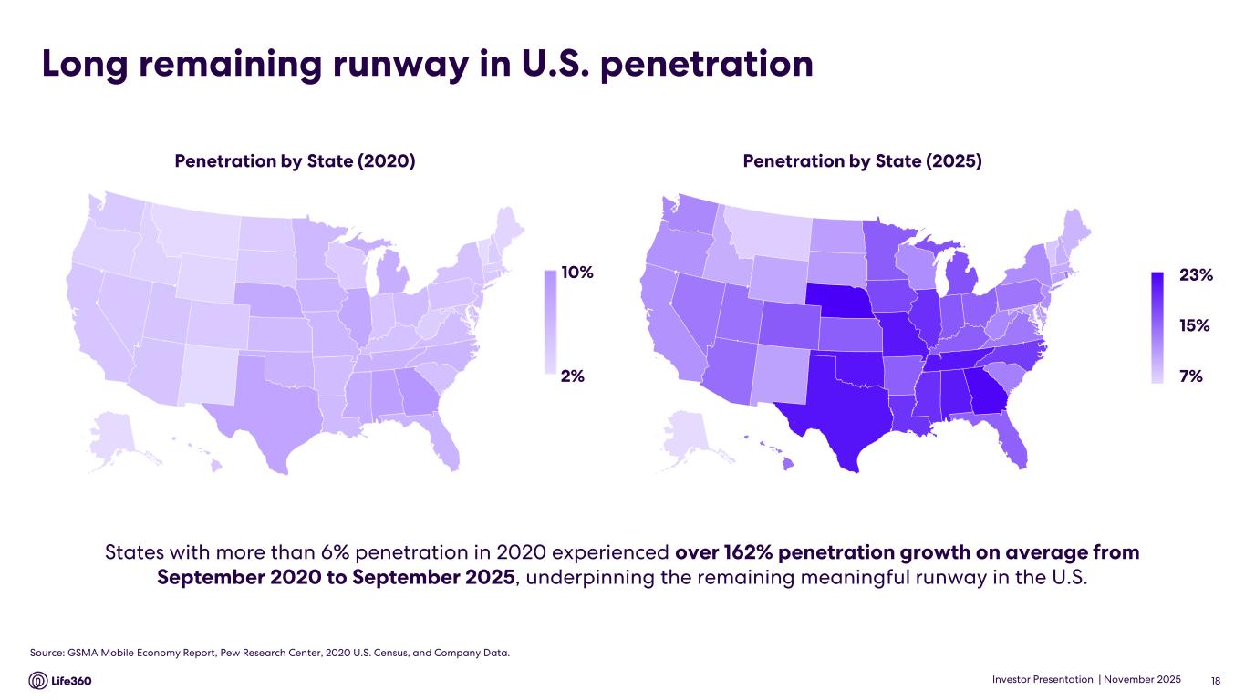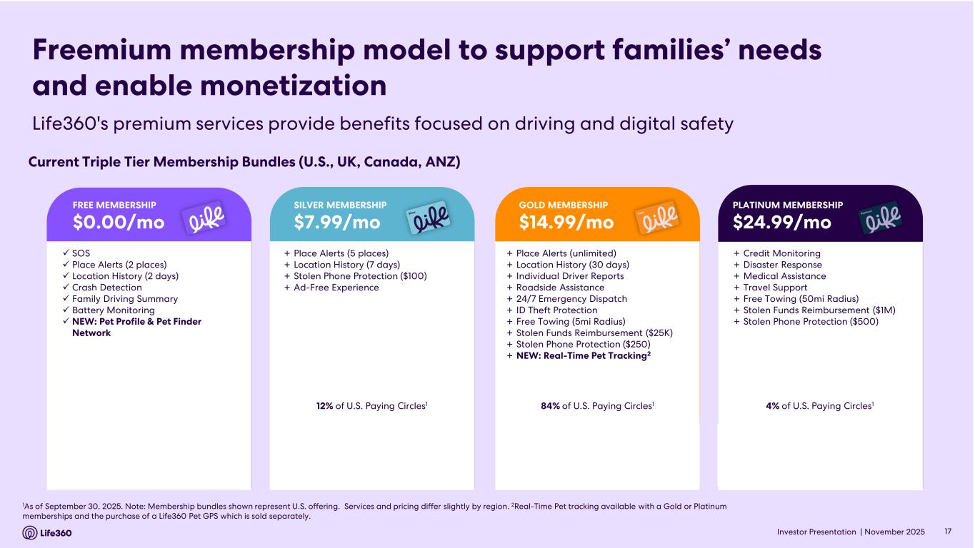 Investor Presentation | November 2025 1As of September 30, 2025. Note: Membership bundles shown represent U.S. offering. Services and pricing differ slightly by region. 2Real-Time Pet tracking available with a Gold or Platinum memberships and the purchase of a Life360 Pet GPS which is sold separately. Freemium membership model to support families’ needs and enable monetization Current Triple Tier Membership Bundles (U.S., UK, Canada, ANZ) + Place Alerts (5 places) + Location History (7 days) + Stolen Phone Protection ($100) + Ad-Free Experience 12% of U.S. Paying Circles1 SILVER MEMBERSHIP $7.99/mo + Place Alerts (unlimited) + Location History (30 days) + Individual Driver Reports + Roadside Assistance + 24/7 Emergency Dispatch + ID Theft Protection + Free Towing (5mi Radius) + Stolen Funds Reimbursement ($25K) + Stolen Phone Protection ($250) + NEW: Real-Time Pet Tracking2 84% of U.S. Paying Circles1 GOLD MEMBERSHIP $14.99/mo + Credit Monitoring + Disaster Response + Medical Assistance + Travel Support + Free Towing (50mi Radius) + Stolen Funds Reimbursement ($1M) + Stolen Phone Protection ($500) 4% of U.S. Paying Circles1 PLATINUM MEMBERSHIP $24.99/mo  SOS  Place Alerts (2 places)  Location History (2 days)  Crash Detection  Family Driving Summary  Battery Monitoring  NEW: Pet Profile & Pet Finder Network FREE MEMBERSHIP $0.00/mo 17 Life360's premium services provide benefits focused on driving and digital safety