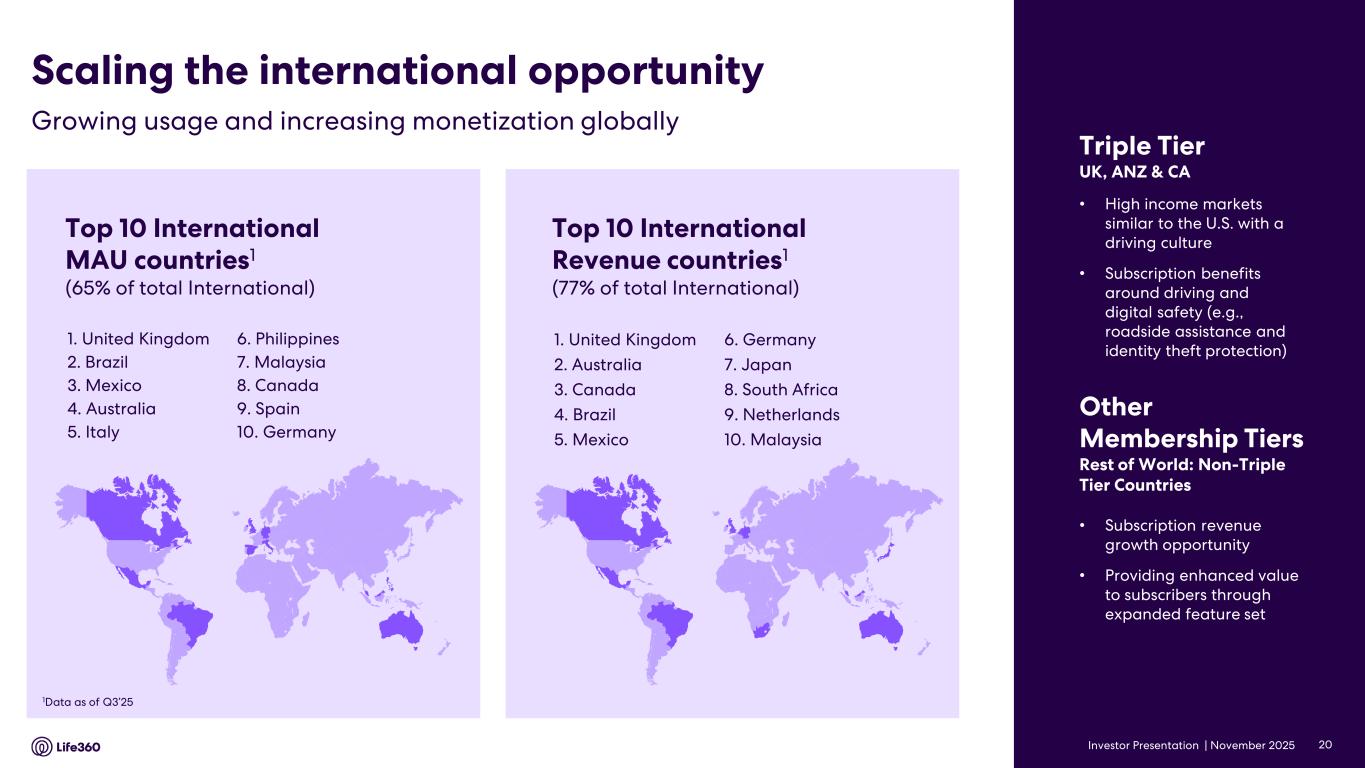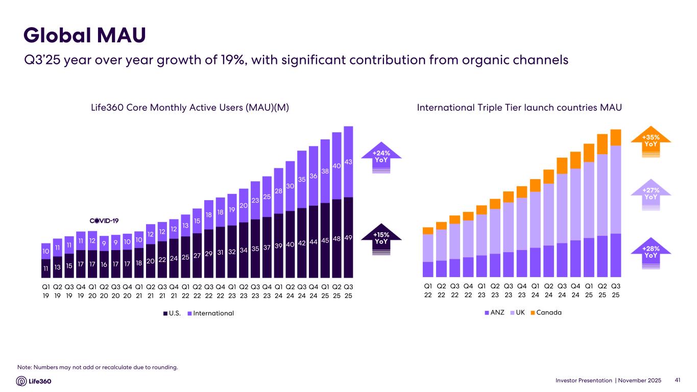 Investor Presentation | November 2025 Life360 Core Monthly Active Users (MAU)(M) Note: Numbers may not add or recalculate due to rounding. Global MAU Q3’25 year over year growth of 19%, with significant contribution from organic channels International Triple Tier launch countries MAU +27% YoY +35% YoY +28% YoY +24% YoY +15% YoY 41 11 13 15 17 17 16 17 17 18 20 22 24 25 27 29 31 32 34 35 37 39 40 42 44 45 48 49 10 11 11 11 12 9 9 10 10 12 12 12 13 15 18 18 19 20 23 25 28 30 35 36 38 40 43 Q1 19 Q2 19 Q3 19 Q4 19 Q1 20 Q2 20 Q3 20 Q4 20 Q1 21 Q2 21 Q3 21 Q4 21 Q1 22 Q2 22 Q3 22 Q4 22 Q1 23 Q2 23 Q3 23 Q4 23 Q1 24 Q2 24 Q3 24 Q4 24 Q1 25 Q2 25 Q3 25 U.S. International Q1 22 Q2 22 Q3 22 Q4 22 Q1 23 Q2 23 Q3 23 Q4 23 Q1 24 Q2 24 Q3 24 Q4 24 Q1 25 Q2 25 Q3 25 ANZ UK Canada