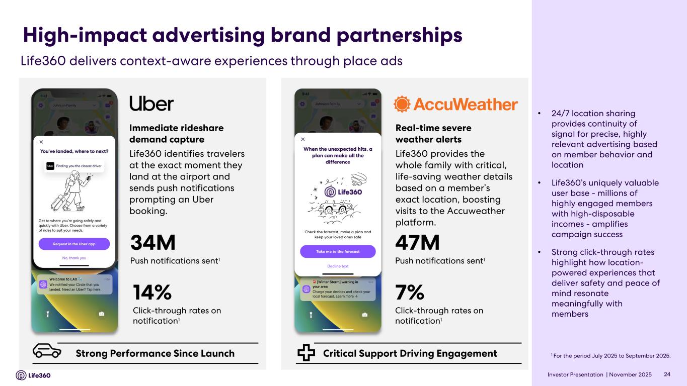 Investor Presentation | November 2025 High-impact advertising brand partnerships 24 Life360 delivers context-aware experiences through place ads 34M Push notifications sent1 14% Click-through rates on notification1 Immediate rideshare demand capture Life360 identifies travelers at the exact moment they land at the airport and sends push notifications prompting an Uber booking. • 24/7 location sharing provides continuity of signal for precise, highly relevant advertising based on member behavior and location • Life360’s uniquely valuable user base - millions of highly engaged members with high-disposable incomes - amplifies campaign success • Strong click-through rates highlight how location- powered experiences that deliver safety and peace of mind resonate meaningfully with members Real-time severe weather alerts Life360 provides the whole family with critical, life-saving weather details based on a member’s exact location, boosting visits to the Accuweather platform. Critical Support Driving Engagement 47M Push notifications sent1 Strong Performance Since Launch 7% Click-through rates on notification1 1 For the period July 2025 to September 2025.