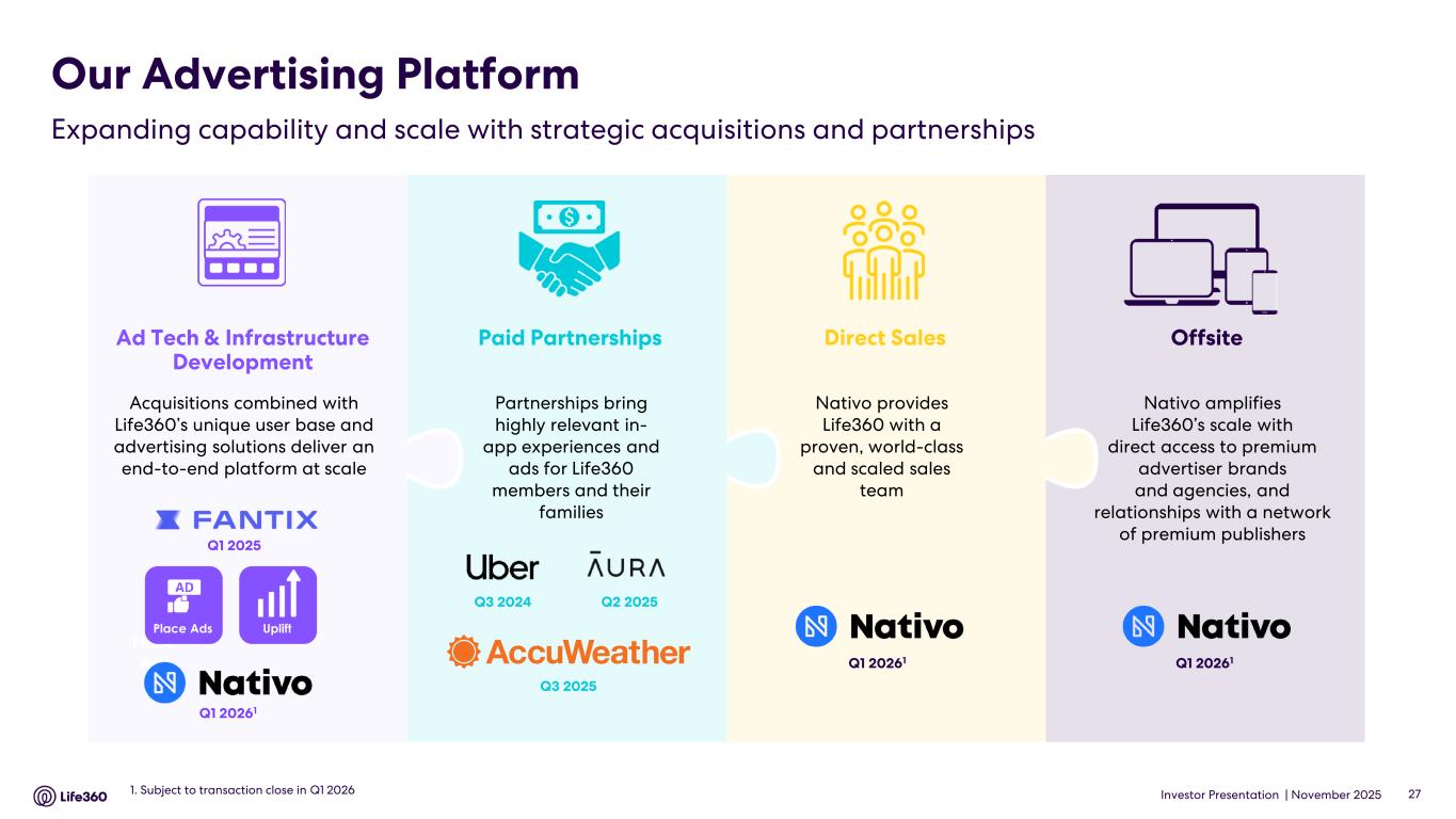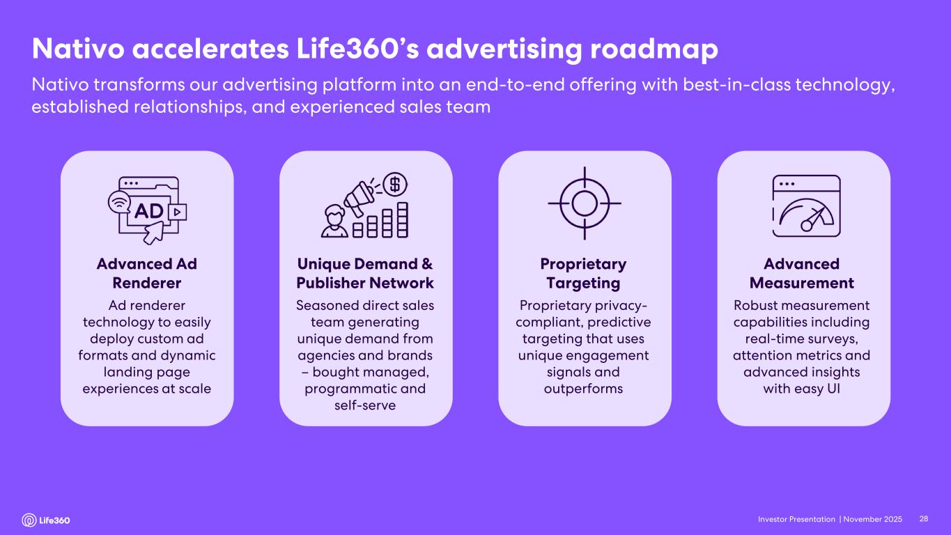 Investor Presentation | November 2025 Our Advertising Platform Expanding capability and scale with strategic acquisitions and partnerships 271. Subject to transaction close in Q1 2026 Nativo provides Life360 with a proven, world-class and scaled sales team Nativo amplifies Life360’s scale with direct access to premium advertiser brands and agencies, and relationships with a network of premium publishers Place Ads Place Ads Uplift Q1 2025 Q1 20261 Q2 2025Q3 2024 Q3 2025 OffsiteDirect SalesPaid PartnershipsAd Tech & Infrastructure Development Partnerships bring highly relevant in- app experiences and ads for Life360 members and their families Acquisitions combined with Life360’s unique user base and advertising solutions deliver an end-to-end platform at scale Q1 20261Q1 20261