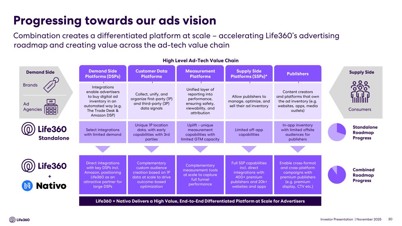 Investor Presentation | November 2025 Progressing towards our ads vision Combination creates a differentiated platform at scale – accelerating Life360’s advertising roadmap and creating value across the ad-tech value chain 30 Demand Side Platforms (DSPs) Customer Data Platforms Measurement Platforms Supply Side Platforms (SSPs)* Publishers High Level Ad-Tech Value Chain Allow publishers to manage, optimize, and sell their ad inventory Collect, unify, and organize first-party (1P) and third-party (3P) data signals Unified layer of reporting into performance, ensuring safety, viewability, and attribution Content creators and platforms that own the ad inventory (e.g. websites, apps, media outlets) Integrations enable advertisers to buy digital ad inventory in an automated way (e.g. The Trade Desk & Amazon DSP) Consumers Supply Side Enable cross-format and cross-platform campaigns with premium publishers (e.g. premium display, CTV etc.) Complementary custom audience creation based on 1P data at scale to drive outcome-based optimization Direct integrations with key DSPs incl. Amazon, positioning Life360 as an attractive partner for large DSPs Full SSP capabilities incl. direct integrations with 400+ premium publishers and 20k+ websites and apps Complementary measurement tools at scale to capture full funnel performance Standalone Unique 1P location data, with early capabilities with 3rd parties Select integrations with limited demand In-app inventory with limited offsite audiences for publishers Uplift - unique measurement capabilities with limited GTM capacity Limited off-app capabilities Life360 + Nativo Delivers a High Value, End-to-End Differentiated Platform at Scale for Advertisers + Standalone Roadmap Progress Combined Roadmap Progress Brands Ad Agencies Demand Side