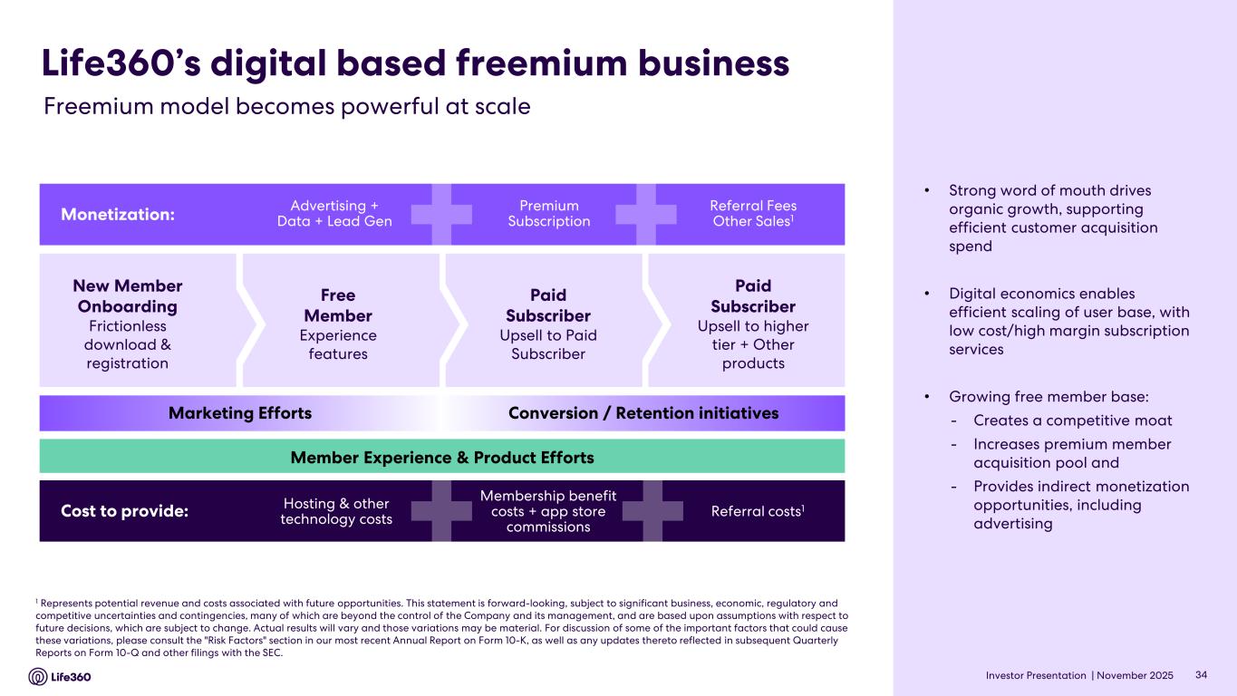 Investor Presentation | November 2025 New Member Onboarding Frictionless download & registration Free Member Experience features Paid Subscriber Upsell to Paid Subscriber Paid Subscriber Upsell to higher tier + Other products Life360’s digital based freemium business Monetization: Advertising + Data + Lead Gen Premium Subscription Referral Fees Other Sales1 Cost to provide: Hosting & other technology costs Membership benefit costs + app store commissions Referral costs1 Marketing Efforts Conversion / Retention initiatives Member Experience & Product Efforts 1 Represents potential revenue and costs associated with future opportunities. This statement is forward-looking, subject to significant business, economic, regulatory and competitive uncertainties and contingencies, many of which are beyond the control of the Company and its management, and are based upon assumptions with respect to future decisions, which are subject to change. Actual results will vary and those variations may be material. For discussion of some of the important factors that could cause these variations, please consult the "Risk Factors" section in our most recent Annual Report on Form 10-K, as well as any updates thereto reflected in subsequent Quarterly Reports on Form 10-Q and other filings with the SEC. 34 Freemium model becomes powerful at scale • Strong word of mouth drives organic growth, supporting efficient customer acquisition spend • Digital economics enables efficient scaling of user base, with low cost/high margin subscription services • Growing free member base: - Creates a competitive moat - Increases premium member acquisition pool and - Provides indirect monetization opportunities, including advertising