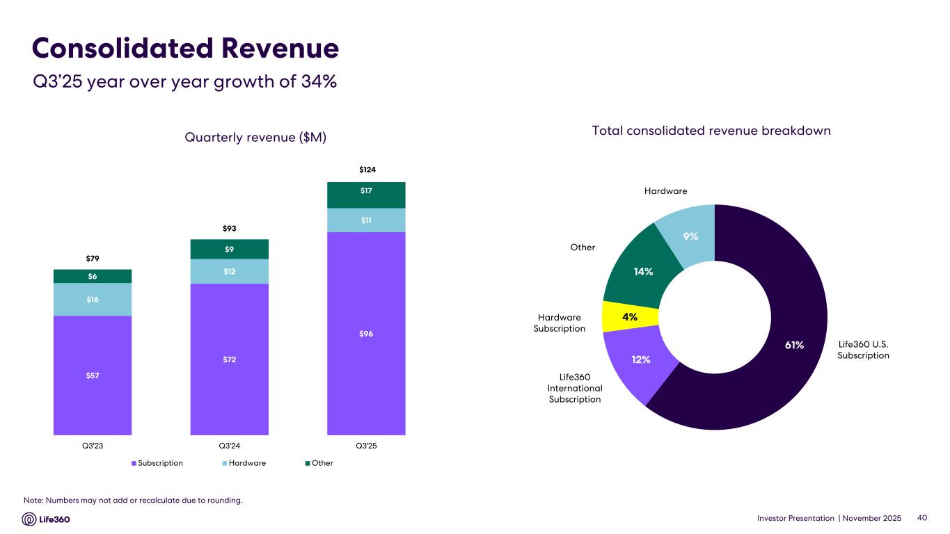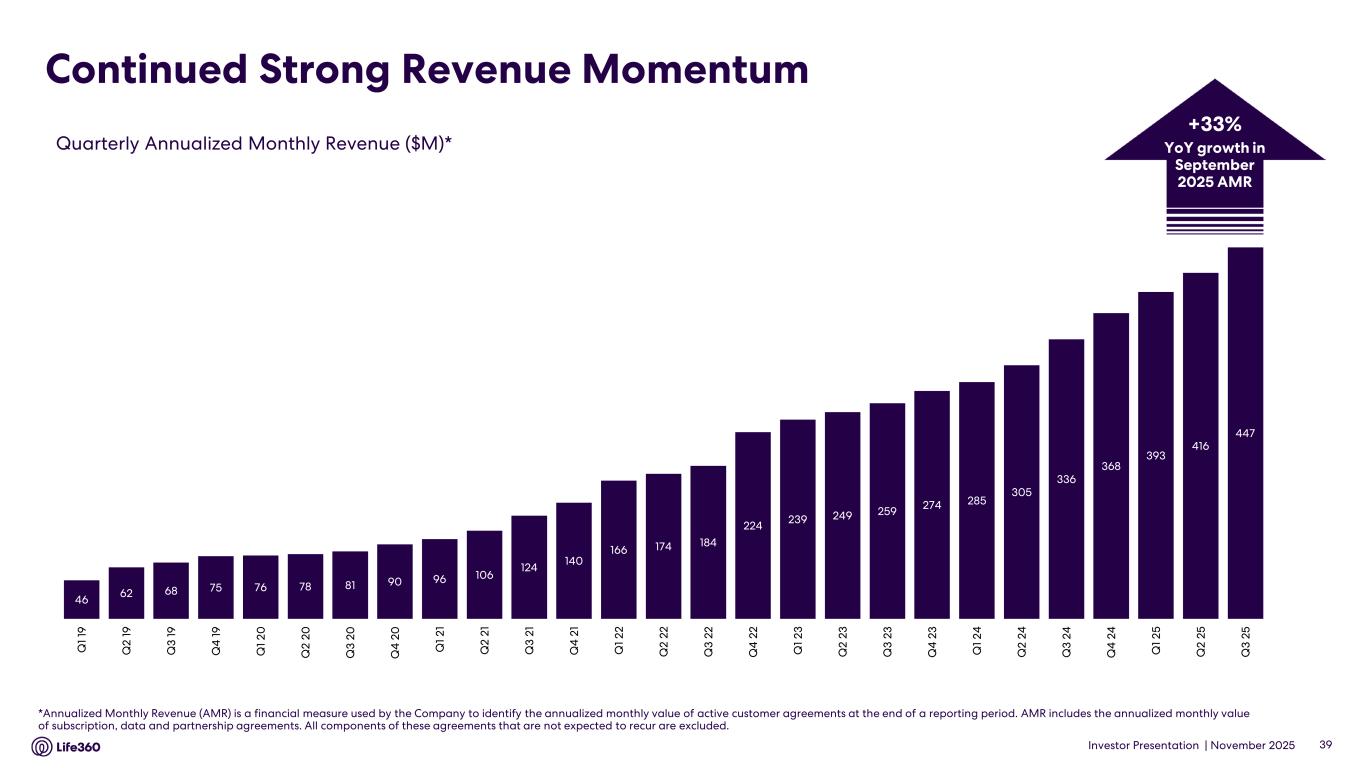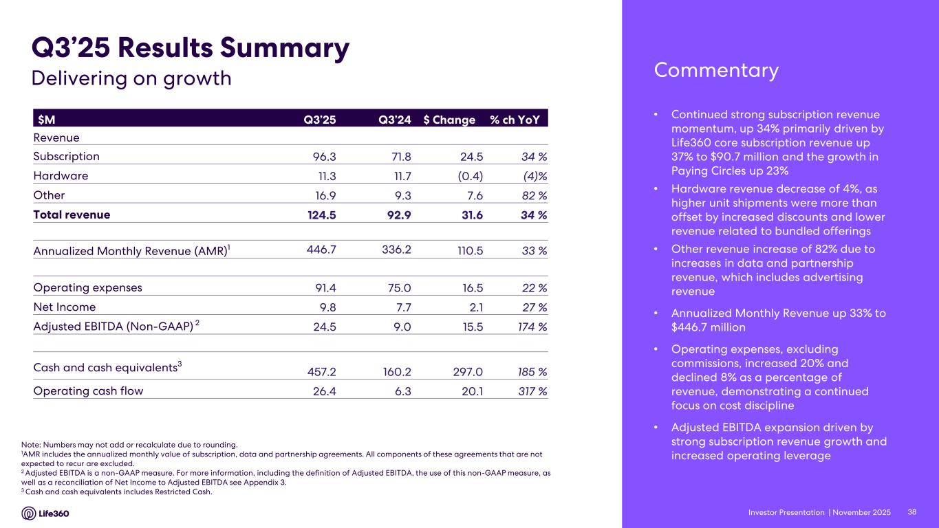 Investor Presentation | November 2025 • Continued strong subscription revenue momentum, up 34% primarily driven by Life360 core subscription revenue up 37% to $90.7 million and the growth in Paying Circles up 23% • Hardware revenue decrease of 4%, as higher unit shipments were more than offset by increased discounts and lower revenue related to bundled offerings • Other revenue increase of 82% due to increases in data and partnership revenue, which includes advertising revenue • Annualized Monthly Revenue up 33% to $446.7 million • Operating expenses, excluding commissions, increased 20% and declined 8% as a percentage of revenue, demonstrating a continued focus on cost discipline • Adjusted EBITDA expansion driven by strong subscription revenue growth and increased operating leverage $M Q3’25 Q3’24 $ Change % ch YoY Revenue Subscription 96.3 71.8 24.5 34 % Hardware 11.3 11.7 (0.4) (4)% Other 16.9 9.3 7.6 82 % Total revenue 124.5 92.9 31.6 34 % Annualized Monthly Revenue (AMR)1 446.7 336.2 110.5 33 % Operating expenses 91.4 75.0 16.5 22 % Net Income 9.8 7.7 2.1 27 % Adjusted EBITDA (Non-GAAP) 2 24.5 9.0 15.5 174 % Cash and cash equivalents3 457.2 160.2 297.0 185 % Operating cash flow 26.4 6.3 20.1 317 % Note: Numbers may not add or recalculate due to rounding. 1AMR includes the annualized monthly value of subscription, data and partnership agreements. All components of these agreements that are not expected to recur are excluded. 2 Adjusted EBITDA is a non-GAAP measure. For more information, including the definition of Adjusted EBITDA, the use of this non-GAAP measure, as well as a reconciliation of Net Income to Adjusted EBITDA see Appendix 3. 3 Cash and cash equivalents includes Restricted Cash. Q3’25 Results Summary CommentaryDelivering on growth 38