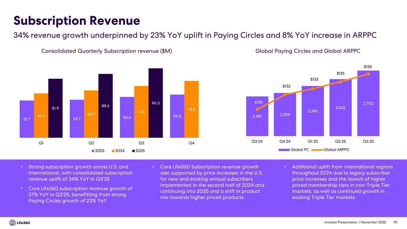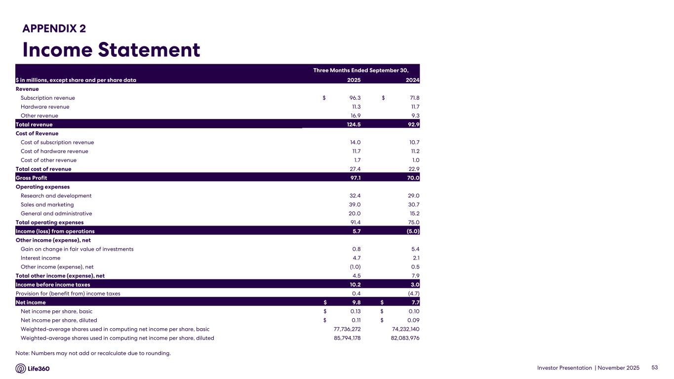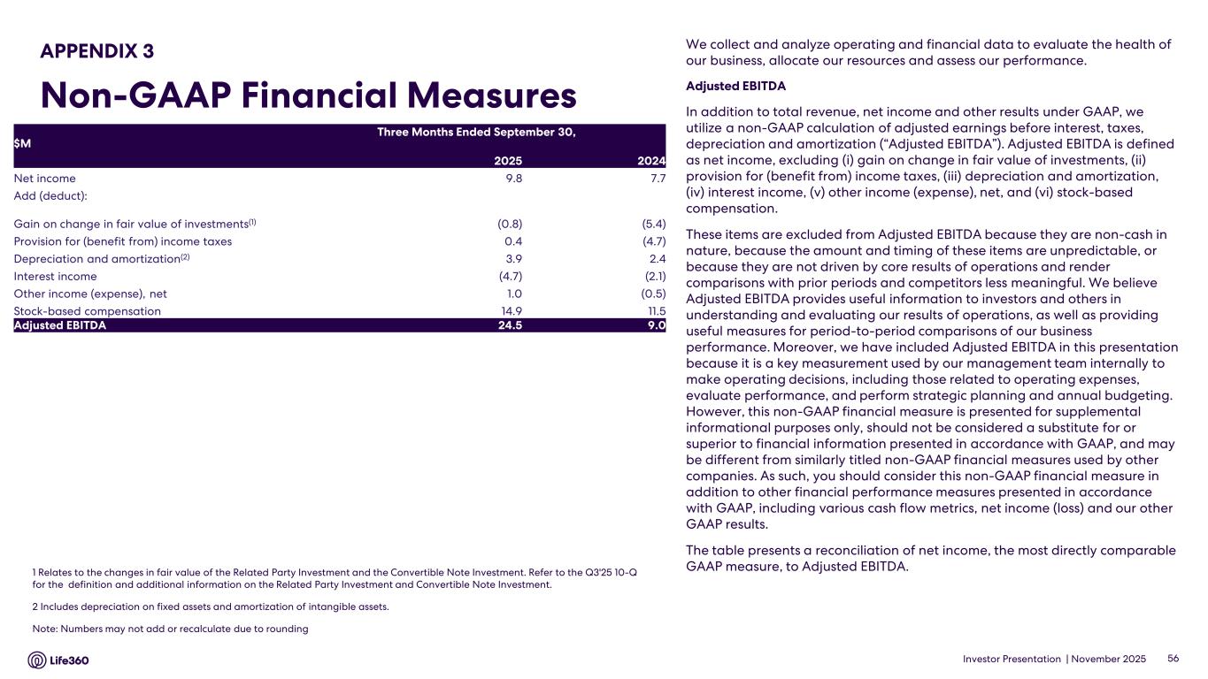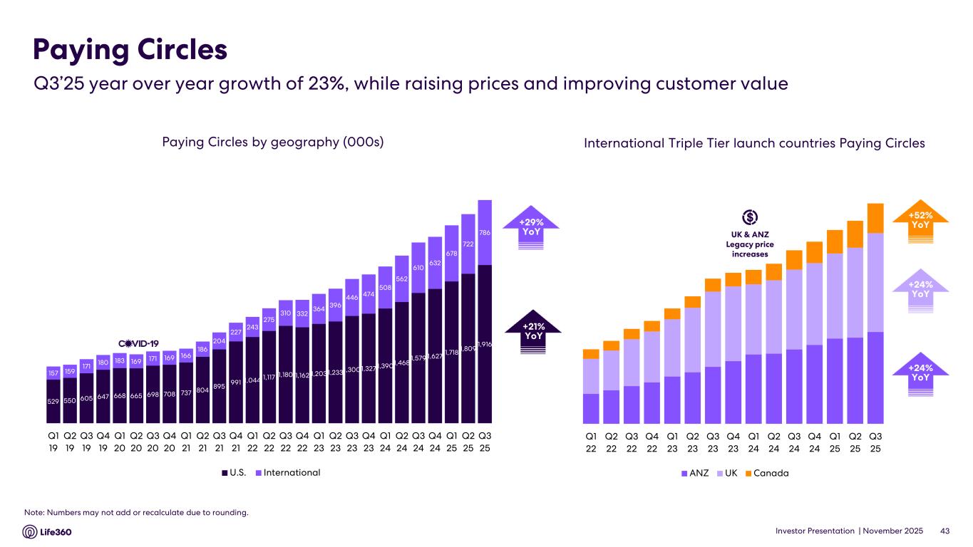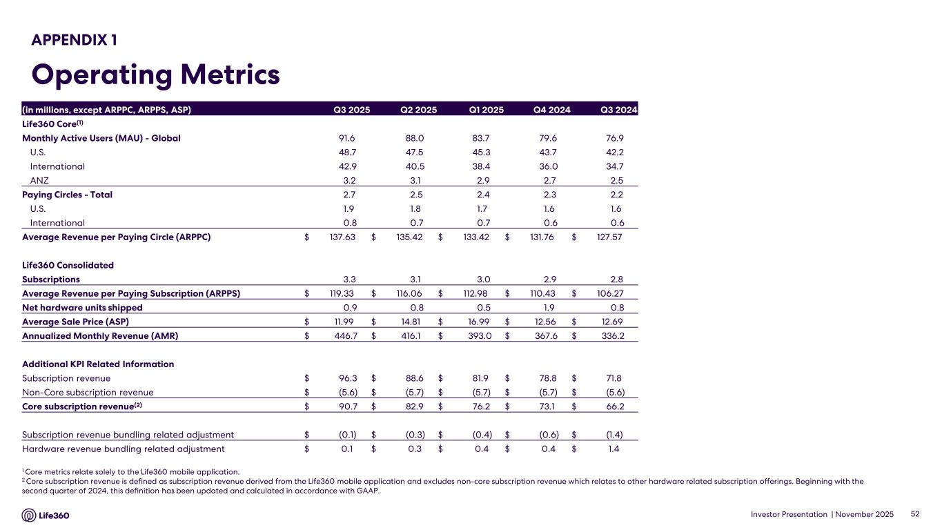 Investor Presentation | November 2025 APPENDIX 1 Operating Metrics 1 Core metrics relate solely to the Life360 mobile application. 2 Core subscription revenue is defined as subscription revenue derived from the Life360 mobile application and excludes non-core subscription revenue which relates to other hardware related subscription offerings. Beginning with the second quarter of 2024, this definition has been updated and calculated in accordance with GAAP. 52 (in millions, except ARPPC, ARPPS, ASP) Q3 2025 Q2 2025 Q1 2025 Q4 2024 Q3 2024 Life360 Core(1) Monthly Active Users (MAU) - Global 91.6 88.0 83.7 79.6 76.9 U.S. 48.7 47.5 45.3 43.7 42.2 International 42.9 40.5 38.4 36.0 34.7 ANZ 3.2 3.1 2.9 2.7 2.5 Paying Circles - Total 2.7 2.5 2.4 2.3 2.2 U.S. 1.9 1.8 1.7 1.6 1.6 International 0.8 0.7 0.7 0.6 0.6 Average Revenue per Paying Circle (ARPPC) $ 137.63 $ 135.42 $ 133.42 $ 131.76 $ 127.57 Life360 Consolidated Subscriptions 3.3 3.1 3.0 2.9 2.8 Average Revenue per Paying Subscription (ARPPS) $ 119.33 $ 116.06 $ 112.98 $ 110.43 $ 106.27 Net hardware units shipped 0.9 0.8 0.5 1.9 0.8 Average Sale Price (ASP) $ 11.99 $ 14.81 $ 16.99 $ 12.56 $ 12.69 Annualized Monthly Revenue (AMR) $ 446.7 $ 416.1 $ 393.0 $ 367.6 $ 336.2 Additional KPI Related Information Subscription revenue $ 96.3 $ 88.6 $ 81.9 $ 78.8 $ 71.8 Non-Core subscription revenue $ (5.6) $ (5.7) $ (5.7) $ (5.7) $ (5.6) Core subscription revenue(2) $ 90.7 $ 82.9 $ 76.2 $ 73.1 $ 66.2 Subscription revenue bundling related adjustment $ (0.1) $ (0.3) $ (0.4) $ (0.6) $ (1.4) Hardware revenue bundling related adjustment $ 0.1 $ 0.3 $ 0.4 $ 0.4 $ 1.4