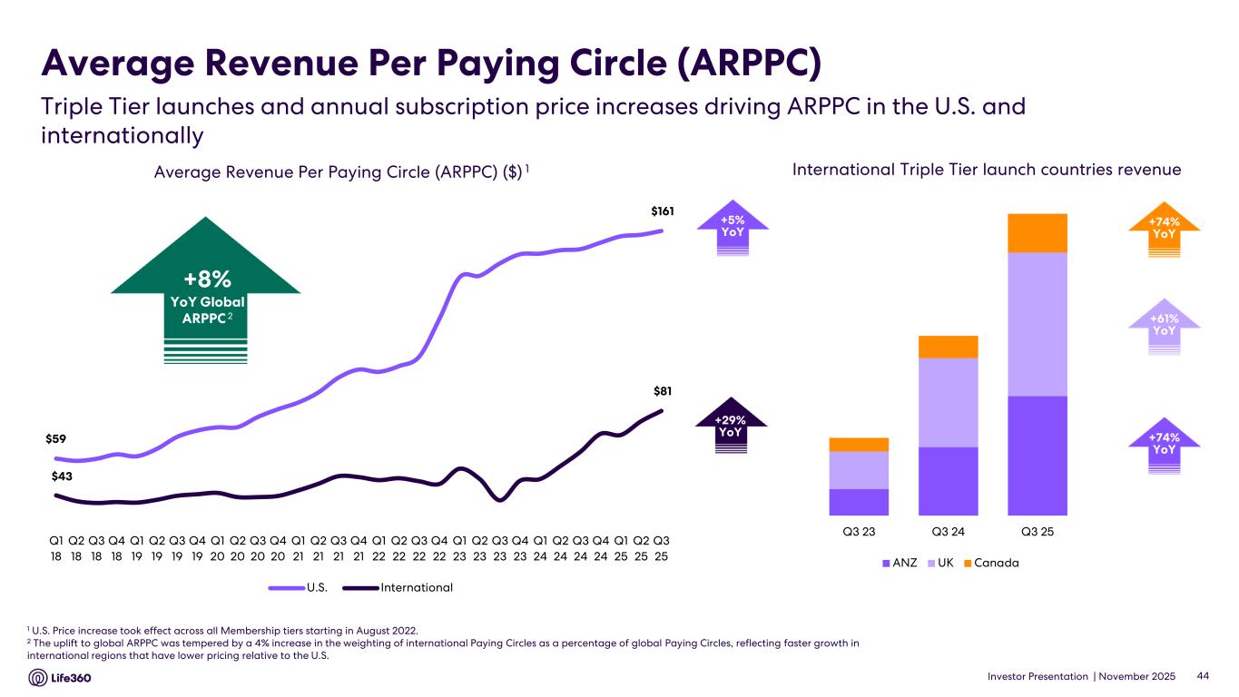 Investor Presentation | November 2025 Paying Circles by geography (000s) Paying Circles $140 $1398 +42% YoY$38 +42% YoYInternational Triple Tier launch countries Paying Circles +24% YoY +52% YoY +24% YoY +29% YoY +21% YoY 43 Note: Numbers may not add or recalculate due to rounding. Q3’25 year over year growth of 23%, while raising prices and improving customer value UK & ANZ Legacy price increases 529 550 605 647 668 665 698 708 737 804 895 991 1,044 1,117 1,180 1,162 1,2031,2331,3001,327 1,3901,468 1,579 1,627 1,718 1,809 1,916 157 159 171 180 183 169 171 169 166 186 204 227 243 275 310 332 364 396 446 474 508 562 610 632 678 722 786 Q1 19 Q2 19 Q3 19 Q4 19 Q1 20 Q2 20 Q3 20 Q4 20 Q1 21 Q2 21 Q3 21 Q4 21 Q1 22 Q2 22 Q3 22 Q4 22 Q1 23 Q2 23 Q3 23 Q4 23 Q1 24 Q2 24 Q3 24 Q4 24 Q1 25 Q2 25 Q3 25 U.S. International Q1 22 Q2 22 Q3 22 Q4 22 Q1 23 Q2 23 Q3 23 Q4 23 Q1 24 Q2 24 Q3 24 Q4 24 Q1 25 Q2 25 Q3 25 ANZ UK Canada