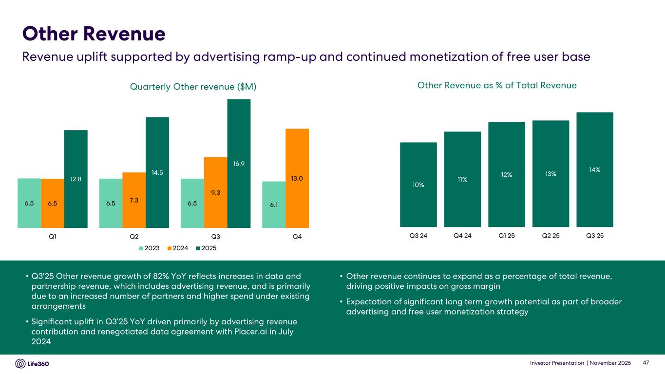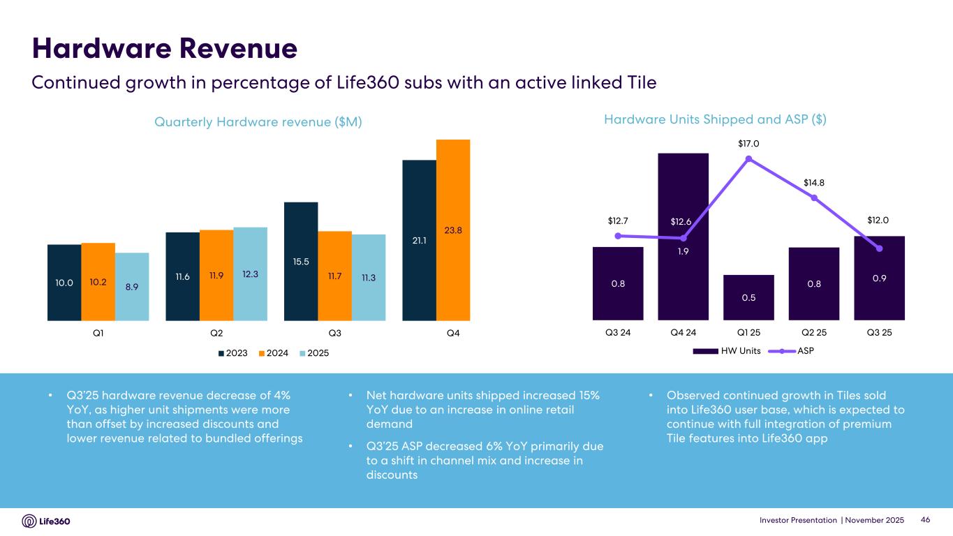 Investor Presentation | November 2025 Hardware Revenue Quarterly Hardware revenue ($M) 46 • Q3’25 hardware revenue decrease of 4% YoY, as higher unit shipments were more than offset by increased discounts and lower revenue related to bundled offerings • Net hardware units shipped increased 15% YoY due to an increase in online retail demand • Q3’25 ASP decreased 6% YoY primarily due to a shift in channel mix and increase in discounts • Observed continued growth in Tiles sold into Life360 user base, which is expected to continue with full integration of premium Tile features into Life360 app Hardware Units Shipped and ASP ($) Continued growth in percentage of Life360 subs with an active linked Tile 10.0 11.6 15.5 21.1 10.2 11.9 11.7 23.8 8.9 12.3 11.3 Q1 Q2 Q3 Q4 2023 2024 2025 0.8 1.9 0.5 0.8 0.9 $12.7 $12.6 $17.0 $14.8 $12.0 8.00 9.00 10.00 11.00 12.00 13.00 14.00 15.00 16.00 17.00 18.00 0.00 0.20 0.40 0.60 0.80 1.00 1.20 1.40 1.60 1.80 2.00 Q3 24 Q4 24 Q1 25 Q2 25 Q3 25 HW Units ASP