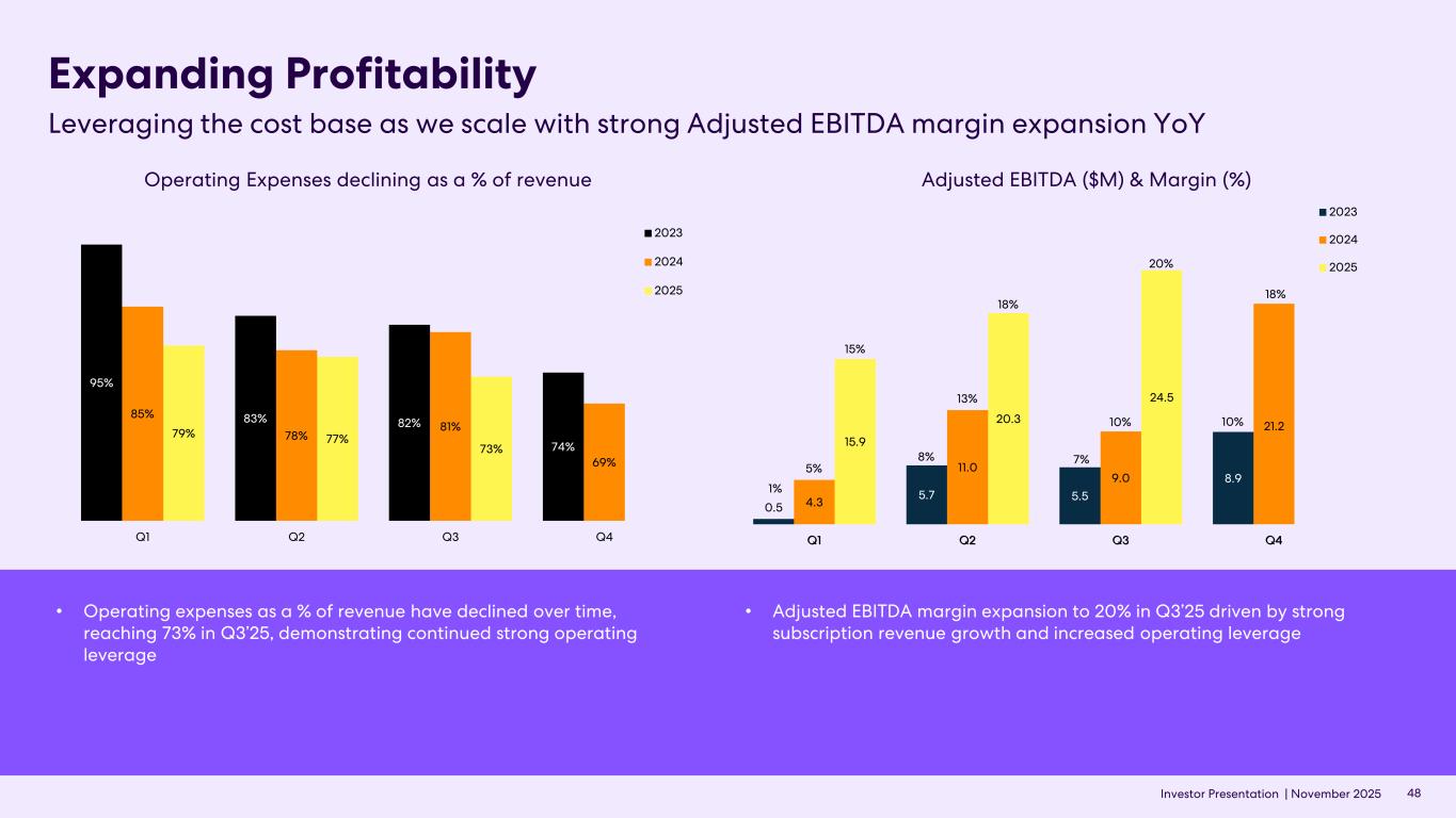 Investor Presentation | November 2025 Expanding Profitability Leveraging the cost base as we scale with strong Adjusted EBITDA margin expansion YoY 48 Adjusted EBITDA ($M) & Margin (%)Operating Expenses declining as a % of revenue • Operating expenses as a % of revenue have declined over time, reaching 73% in Q3’25, demonstrating continued strong operating leverage • Adjusted EBITDA margin expansion to 20% in Q3’25 driven by strong subscription revenue growth and increased operating leverage 95% 83% 82% 74% 85% 78% 81% 69% 79% 77% 73% Q1 Q2 Q3 Q4 2023 2024 2025 0.5 5.7 5.5 8.9 4.3 11.0 9.0 21.2 15.9 20.3 24.5 Q1 Q2 Q3 Q4 2023 2024 2025 1% 8% 7% 10% 5% 13% 10% 18% 15% 18% 20%