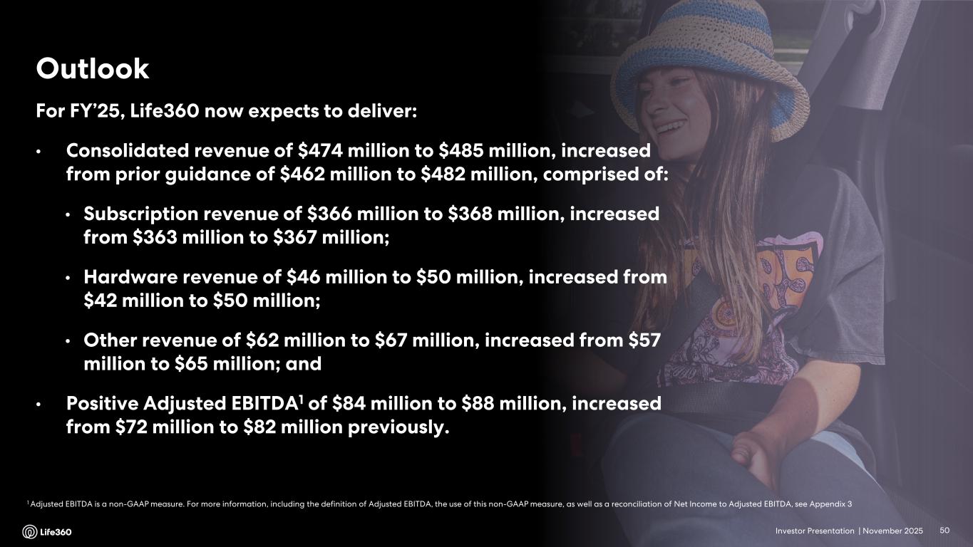 Investor Presentation | November 2025 1 Adjusted EBITDA is a non-GAAP measure. For more information, including the definition of Adjusted EBITDA, the use of this non-GAAP measure, as well as a reconciliation of Net Income to Adjusted EBITDA, see Appendix 3 Outlook 50 For FY’25, Life360 now expects to deliver: • Consolidated revenue of $474 million to $485 million, increased from prior guidance of $462 million to $482 million, comprised of: • Subscription revenue of $366 million to $368 million, increased from $363 million to $367 million; • Hardware revenue of $46 million to $50 million, increased from $42 million to $50 million; • Other revenue of $62 million to $67 million, increased from $57 million to $65 million; and • Positive Adjusted EBITDA1 of $84 million to $88 million, increased from $72 million to $82 million previously.