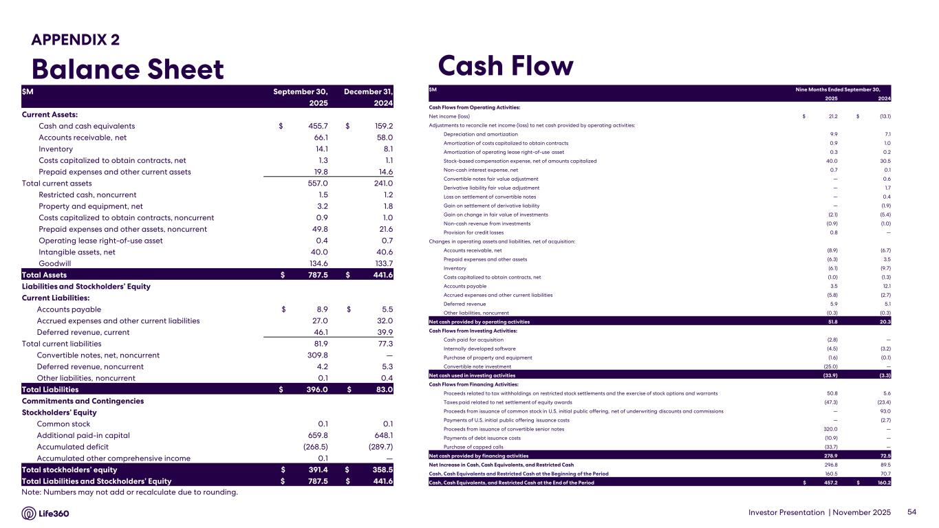 Investor Presentation | November 2025 APPENDIX 2 Income Statement 53 Note: Numbers may not add or recalculate due to rounding. Three Months Ended September 30, $ in millions, except share and per share data 2025 2024 Revenue Subscription revenue $ 96.3 $ 71.8 Hardware revenue 11.3 11.7 Other revenue 16.9 9.3 Total revenue 124.5 92.9 Cost of Revenue Cost of subscription revenue 14.0 10.7 Cost of hardware revenue 11.7 11.2 Cost of other revenue 1.7 1.0 Total cost of revenue 27.4 22.9 Gross Profit 97.1 70.0 Operating expenses Research and development 32.4 29.0 Sales and marketing 39.0 30.7 General and administrative 20.0 15.2 Total operating expenses 91.4 75.0 Income (loss) from operations 5.7 (5.0) Other income (expense), net Gain on change in fair value of investments 0.8 5.4 Interest income 4.7 2.1 Other income (expense), net (1.0) 0.5 Total other income (expense), net 4.5 7.9 Income before income taxes 10.2 3.0 Provision for (benefit from) income taxes 0.4 (4.7) Net income $ 9.8 $ 7.7 Net income per share, basic $ 0.13 $ 0.10 Net income per share, diluted $ 0.11 $ 0.09 Weighted-average shares used in computing net income per share, basic 77,736,272 74,232,140 Weighted-average shares used in computing net income per share, diluted 85,794,178 82,083,976