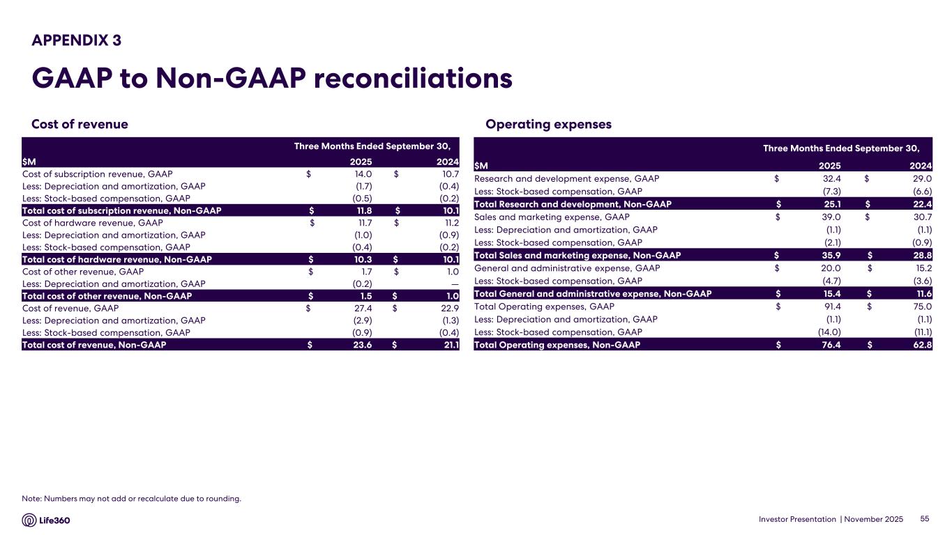 Investor Presentation | November 2025 Operating expenses APPENDIX 3 GAAP to Non-GAAP reconciliations 55 Note: Numbers may not add or recalculate due to rounding. Cost of revenue Three Months Ended September 30, $M 2025 2024 Research and development expense, GAAP $ 32.4 $ 29.0 Less: Stock-based compensation, GAAP (7.3) (6.6) Total Research and development, Non-GAAP $ 25.1 $ 22.4 Sales and marketing expense, GAAP $ 39.0 $ 30.7 Less: Depreciation and amortization, GAAP (1.1) (1.1) Less: Stock-based compensation, GAAP (2.1) (0.9) Total Sales and marketing expense, Non-GAAP $ 35.9 $ 28.8 General and administrative expense, GAAP $ 20.0 $ 15.2 Less: Stock-based compensation, GAAP (4.7) (3.6) Total General and administrative expense, Non-GAAP $ 15.4 $ 11.6 Total Operating expenses, GAAP $ 91.4 $ 75.0 Less: Depreciation and amortization, GAAP (1.1) (1.1) Less: Stock-based compensation, GAAP (14.0) (11.1) Total Operating expenses, Non-GAAP $ 76.4 $ 62.8 Three Months Ended September 30, $M 2025 2024 Cost of subscription revenue, GAAP $ 14.0 $ 10.7 Less: Depreciation and amortization, GAAP (1.7) (0.4) Less: Stock-based compensation, GAAP (0.5) (0.2) Total cost of subscription revenue, Non-GAAP $ 11.8 $ 10.1 Cost of hardware revenue, GAAP $ 11.7 $ 11.2 Less: Depreciation and amortization, GAAP (1.0) (0.9) Less: Stock-based compensation, GAAP (0.4) (0.2) Total cost of hardware revenue, Non-GAAP $ 10.3 $ 10.1 Cost of other revenue, GAAP $ 1.7 $ 1.0 Less: Depreciation and amortization, GAAP (0.2) — Total cost of other revenue, Non-GAAP $ 1.5 $ 1.0 Cost of revenue, GAAP $ 27.4 $ 22.9 Less: Depreciation and amortization, GAAP (2.9) (1.3) Less: Stock-based compensation, GAAP (0.9) (0.4) Total cost of revenue, Non-GAAP $ 23.6 $ 21.1