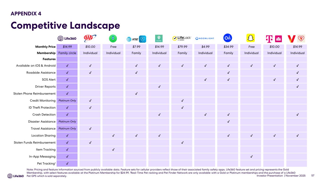 Investor Presentation | November 2025 57 Note: Pricing and feature information sourced from publicly available data. Feature sets for cellular providers reflect those of their associated family safety apps. Life360 feature set and pricing represents the Gold Membership, with select features available at the Platinum Membership for $24.99. 1Real-Time Pet racking and Pet Finder Network are only available with a Gold or Platinum memberships and the purchase of a Life360 Pet GPS which is sold separately. APPENDIX 4 Competitive Landscape Monthly Price $14.99 $10.00 Free $7.99 $14.99 $79.99 $4.99 $34.99 Free $10.00 $14.99 Membership Family circle Individual Individual Family Individual Family Individual Family Individual Individual Individual Features Available on iOS & Android Roadside Assistance SOS Alert Driver Reports Stolen Phone Reimbursement Credit Monitoring Platinum Only ID Theft Protection Crash Detection Disaster Assistance Platinum Only Travel Assistance Platinum Only Location Sharing Stolen Funds Reimbursement Item Tracking In-App Messaging Pet Tracking1