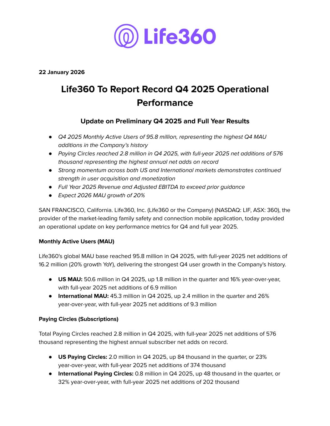22 January 2026 Life360 To Report Record Q4 2025 Operational Performance Update on Preliminary Q4 2025 and Full Year Results ●​ Q4 2025 Monthly Active Users of 95.8 million, representing the highest Q4 MAU additions in the Company’s history ●​ Paying Circles reached 2.8 million in Q4 2025, with full-year 2025 net additions of 576 thousand representing the highest annual net adds on record ●​ Strong momentum across both US and International markets demonstrates continued strength in user acquisition and monetization ●​ Full Year 2025 Revenue and Adjusted EBITDA to exceed prior guidance ●​ Expect 2026 MAU growth of 20% SAN FRANCISCO, California. Life360, Inc. (Life360 or the Company) (NASDAQ: LIF, ASX: 360), the provider of the market-leading family safety and connection mobile application, today provided an operational update on key performance metrics for Q4 and full year 2025. Monthly Active Users (MAU) Life360's global MAU base reached 95.8 million in Q4 2025, with full-year 2025 net additions of 16.2 million (20% growth YoY), delivering the strongest Q4 user growth in the Company's history. ●​ US MAU: 50.6 million in Q4 2025, up 1.8 million in the quarter and 16% year-over-year, with full-year 2025 net additions of 6.9 million ●​ International MAU: 45.3 million in Q4 2025, up 2.4 million in the quarter and 26% year-over-year, with full-year 2025 net additions of 9.3 million Paying Circles (Subscriptions) Total Paying Circles reached 2.8 million in Q4 2025, with full-year 2025 net additions of 576 thousand representing the highest annual subscriber net adds on record. ●​ US Paying Circles: 2.0 million in Q4 2025, up 84 thousand in the quarter, or 23% year-over-year, with full-year 2025 net additions of 374 thousand ●​ International Paying Circles: 0.8 million in Q4 2025, up 48 thousand in the quarter, or 32% year-over-year, with full-year 2025 net additions of 202 thousand