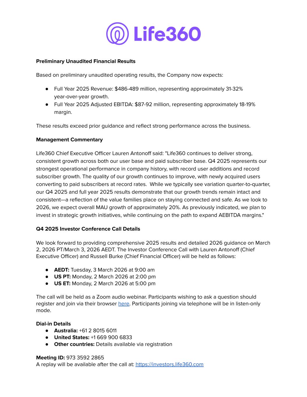 Preliminary Unaudited Financial Results Based on preliminary unaudited operating results, the Company now expects: ●​ Full Year 2025 Revenue: $486-489 million, representing approximately 31-32% year-over-year growth. ●​ Full Year 2025 Adjusted EBITDA: $87-92 million, representing approximately 18-19% margin. These results exceed prior guidance and reflect strong performance across the business. Management Commentary Life360 Chief Executive Officer Lauren Antonoff said: "Life360 continues to deliver strong, consistent growth across both our user base and paid subscriber base. Q4 2025 represents our strongest operational performance in company history, with record user additions and record subscriber growth. The quality of our growth continues to improve, with newly acquired users converting to paid subscribers at record rates. While we typically see variation quarter-to-quarter, our Q4 2025 and full year 2025 results demonstrate that our growth trends remain intact and consistent—a reflection of the value families place on staying connected and safe. As we look to 2026, we expect overall MAU growth of approximately 20%. As previously indicated, we plan to invest in strategic growth initiatives, while continuing on the path to expand AEBITDA margins." Q4 2025 Investor Conference Call Details We look forward to providing comprehensive 2025 results and detailed 2026 guidance on March 2, 2026 PT/March 3, 2026 AEDT. The Investor Conference Call with Lauren Antonoff (Chief Executive Officer) and Russell Burke (Chief Financial Officer) will be held as follows: ●​ AEDT: Tuesday, 3 March 2026 at 9:00 am ●​ US PT: Monday, 2 March 2026 at 2:00 pm ●​ US ET: Monday, 2 March 2026 at 5:00 pm​ The call will be held as a Zoom audio webinar. Participants wishing to ask a question should register and join via their browser here. Participants joining via telephone will be in listen-only mode. Dial-in Details ●​ Australia: +61 2 8015 6011 ●​ United States: +1 669 900 6833 ●​ Other countries: Details available via registration​ Meeting ID: 973 3592 2865 A replay will be available after the call at: https://investors.life360.com