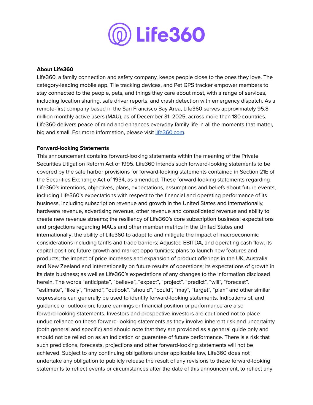 About Life360 Life360, a family connection and safety company, keeps people close to the ones they love. The category-leading mobile app, Tile tracking devices, and Pet GPS tracker empower members to stay connected to the people, pets, and things they care about most, with a range of services, including location sharing, safe driver reports, and crash detection with emergency dispatch. As a remote-first company based in the San Francisco Bay Area, Life360 serves approximately 95.8 million monthly active users (MAU), as of December 31, 2025, across more than 180 countries. Life360 delivers peace of mind and enhances everyday family life in all the moments that matter, big and small. For more information, please visit life360.com. Forward-looking Statements This announcement contains forward-looking statements within the meaning of the Private Securities Litigation Reform Act of 1995. Life360 intends such forward-looking statements to be covered by the safe harbor provisions for forward-looking statements contained in Section 21E of the Securities Exchange Act of 1934, as amended. These forward-looking statements regarding Life360’s intentions, objectives, plans, expectations, assumptions and beliefs about future events, including Life360’s expectations with respect to the financial and operating performance of its business, including subscription revenue and growth in the United States and internationally, hardware revenue, advertising revenue, other revenue and consolidated revenue and ability to create new revenue streams; the resiliency of Life360’s core subscription business; expectations and projections regarding MAUs and other member metrics in the United States and internationally; the ability of Life360 to adapt to and mitigate the impact of macroeconomic considerations including tariffs and trade barriers; Adjusted EBITDA, and operating cash flow; its capital position; future growth and market opportunities; plans to launch new features and products; the impact of price increases and expansion of product offerings in the UK, Australia and New Zealand and internationally on future results of operations; its expectations of growth in its data business; as well as Life360’s expectations of any changes to the information disclosed herein. The words “anticipate”, “believe”, “expect”, “project”, “predict”, “will”, “forecast”, “estimate”, “likely”, “intend”, “outlook”, “should”, “could”, “may”, “target”, “plan” and other similar expressions can generally be used to identify forward-looking statements. Indications of, and guidance or outlook on, future earnings or financial position or performance are also forward-looking statements. Investors and prospective investors are cautioned not to place undue reliance on these forward-looking statements as they involve inherent risk and uncertainty (both general and specific) and should note that they are provided as a general guide only and should not be relied on as an indication or guarantee of future performance. There is a risk that such predictions, forecasts, projections and other forward-looking statements will not be achieved. Subject to any continuing obligations under applicable law, Life360 does not undertake any obligation to publicly release the result of any revisions to these forward-looking statements to reflect events or circumstances after the date of this announcement, to reflect any